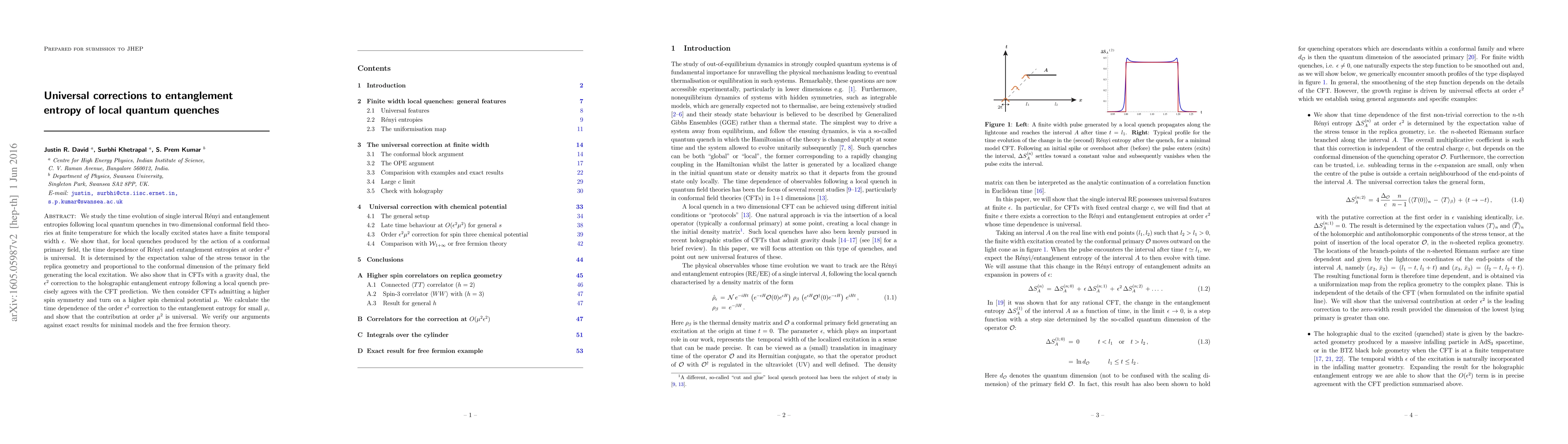 Researchers found that local quantum quenches in conformal field theories produce universal corrections to entanglement entropy of order epsilon squared, determined by the stress tensor's expectation value and primary field conformal dimension. These results match holographic predictions for gravity duals and show universality with higher spin symmetries.