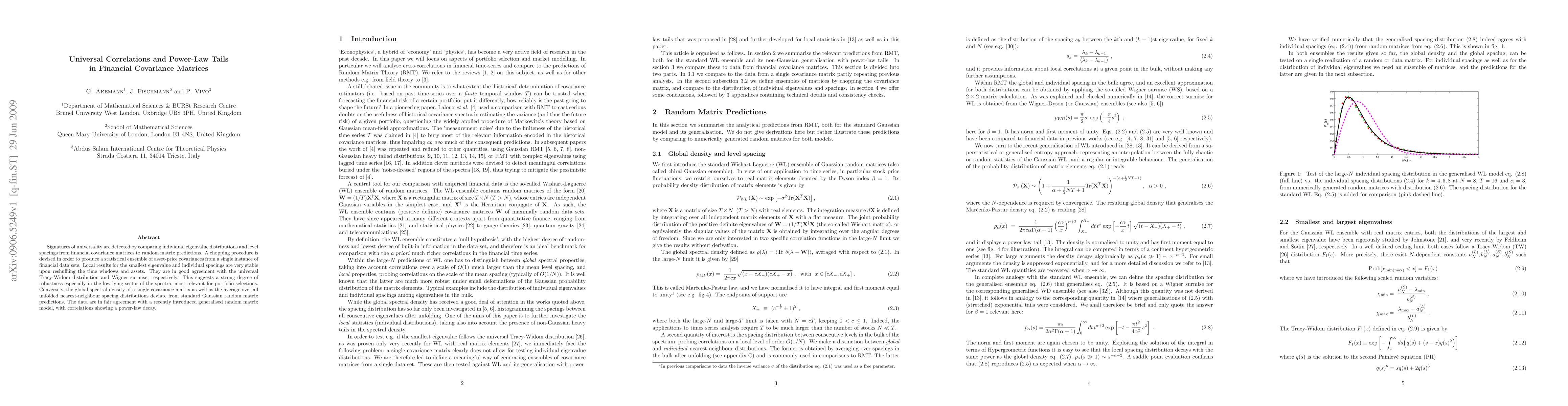 This paper investigates the universality of financial covariance matrices by comparing their eigenvalue distributions to random matrix theory predictions. The study finds robust agreement with the Tracy-Widom distribution and Wigner surmise for local spectral properties, indicating stability in portfolio selection. However, global spectral density and average nearest-neighbour spacings deviate from standard predictions, aligning instead with a generalised random matrix model featuring power-law decay correlations.