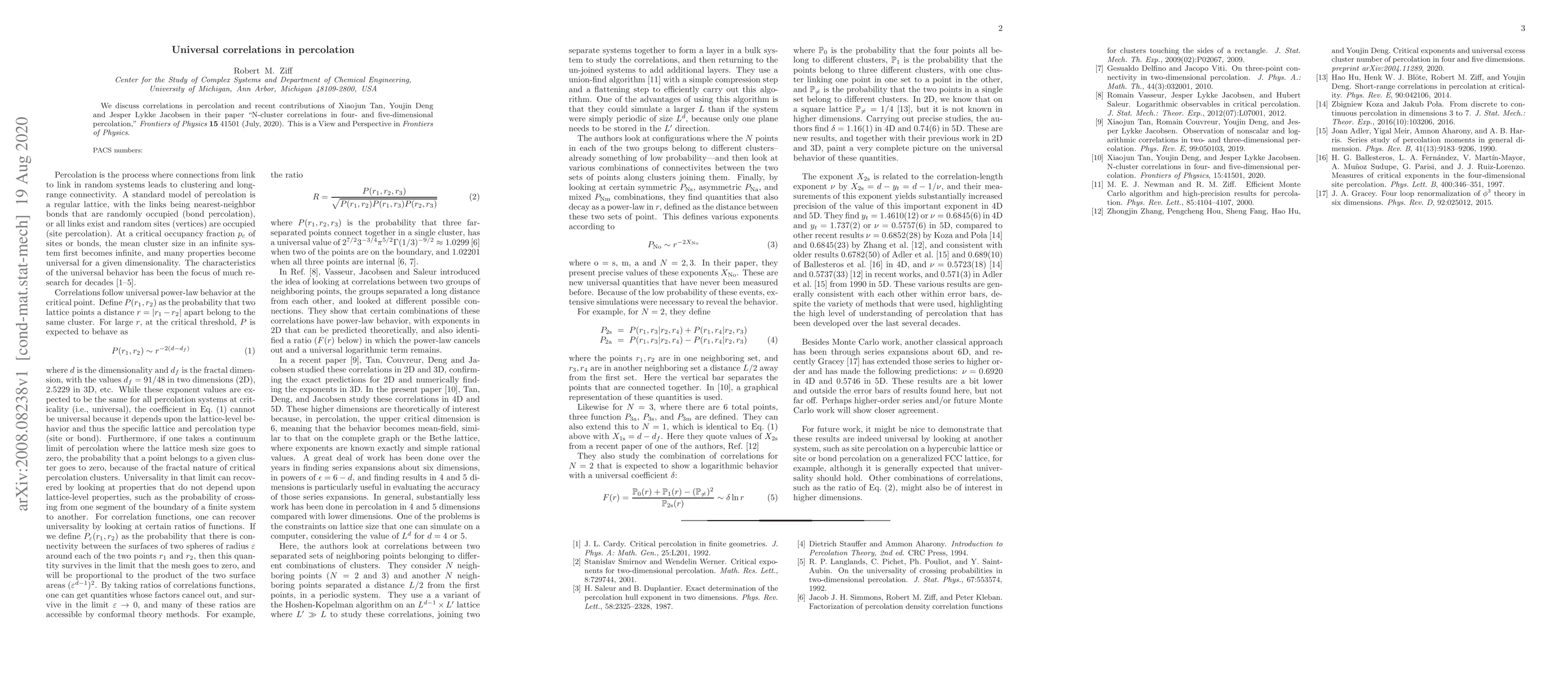 This paper explores universal correlations in percolation, highlighting recent advancements by Xiaojun Tan, Youjin Deng, and Jesper Lykke Jacobsen, particularly focusing on N-cluster correlations in four- and five-dimensional percolation. The study provides insights into the broader implications of these findings for percolation theory.