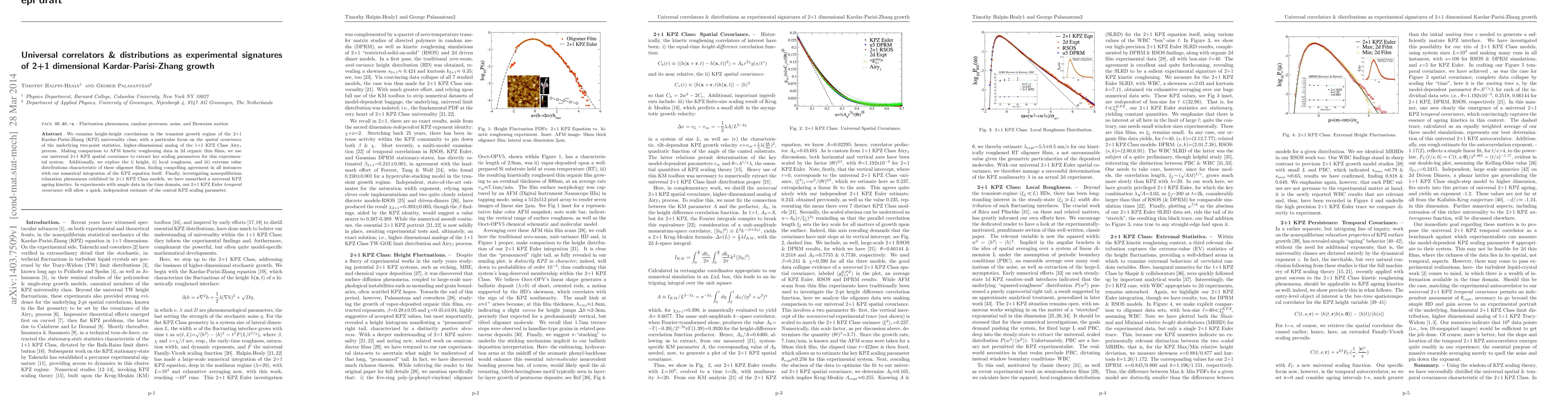 We examine height-height correlations in the transient growth regime of the 2+1 Kardar-Parisi-Zhang (KPZ) universality class, with a particular focus on the {\it spatial covariance} of the underlying two-point statistics, higher-dimensional analog of the 1+1 KPZ Class Airy$_1$ process. Making comparison to AFM kinetic roughening data in 2d organic thin films, we use our universal 2+1 KPZ spatial covariance to extract key scaling parameters for this experimental system. Additionally, we explore the i) height, ii) local roughness, and iii) extreme value distributions characteristic of these oligomer films, finding compelling agreement in all instances with our numerical integration of the KPZ equation itself. Finally, investigating nonequilibrium relaxation phenomena exhibited by 2+1 KPZ Class models, we have unearthed a universal KPZ ageing kinetics. In experiments with ample data in the time domain, our 2+1 KPZ Euler {\it temporal covariance} will allow a quick, independent estimate of the central KPZ scaling parameter.
