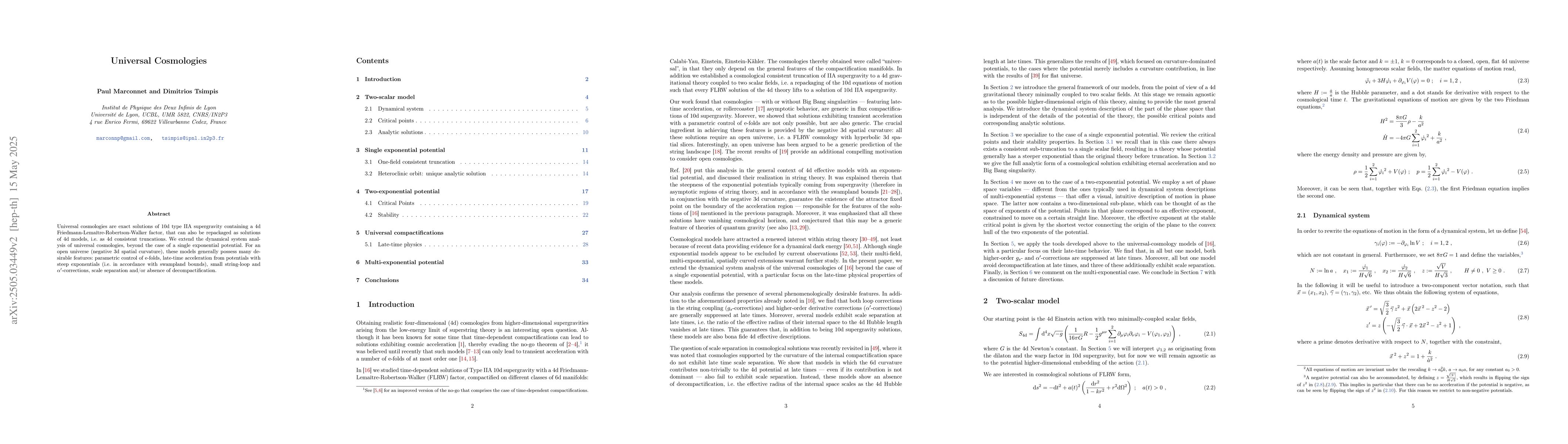 Universal cosmologies are exact solutions of 10d type IIA supergravity containing a 4d Friedmann-Lema\^{i}tre-Robertson-Walker factor, that can also be repackaged as solutions of 4d models, i.e. as 4d consistent truncations. We extend the dynamical system analysis of universal cosmologies, beyond the case of a single exponential potential. For an open universe (negative 3d spatial curvature), these models generally possess many desirable features: parametric control of e-folds, late-time acceleration from potentials with steep exponentials (i.e. in accordance with swampland bounds), small string-loop and $\alpha'$-corrections, scale separation and/or absence of decompactification.