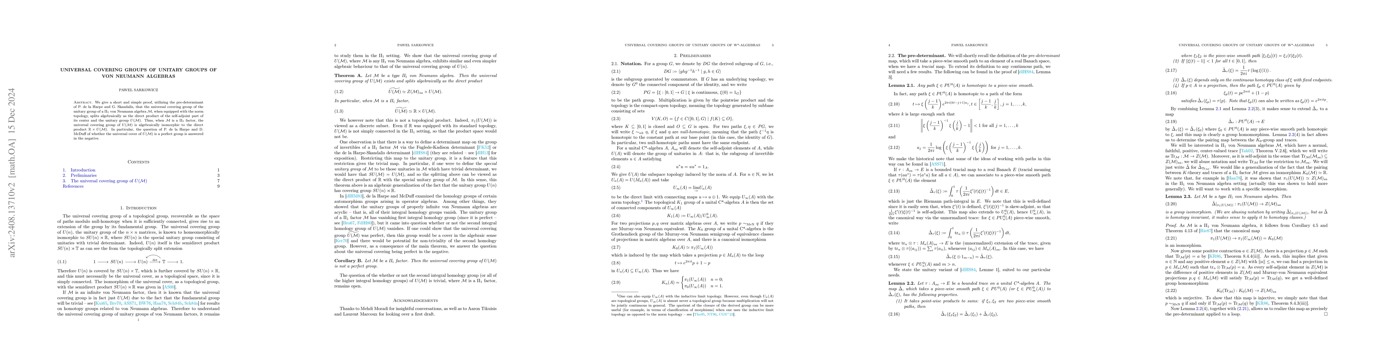 We give a short and simple proof, utilizing the pre-determinant of P. de la Harpe and G. Skandalis, that the universal covering group of the unitary group of a II$_1$ von Neumann algebra $\mathcal{M}$, when equipped with the norm topology, splits algebraically as the direct product of the self-adjoint part of its center and the unitary group $U(\mathcal{M})$. Thus, when $\mathcal{M}$ is a II$_1$ factor, the universal covering group of $U(\mathcal{M})$ is algebraically isomorphic to the direct product $\mathbb{R} \times U(\mathcal{M})$. In particular, the question of P. de la Harpe and D. McDuff of whether the universal cover of $U(\mathcal{M})$ is a perfect group is answered in the negative.