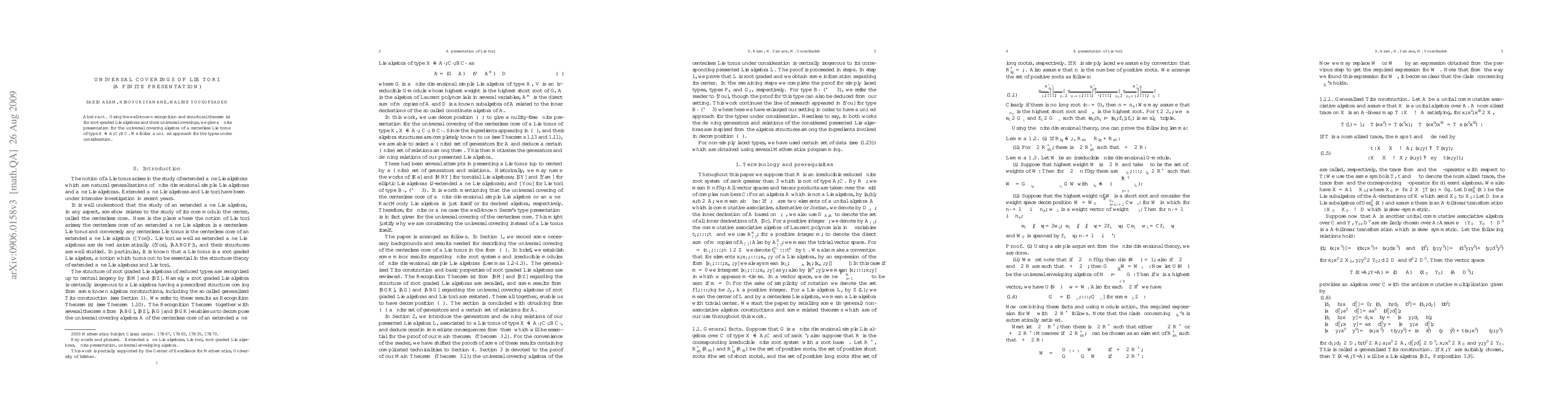 Using the well-known recognition and structural theorem(s) for root-graded Lie algebras and their universal coverings, we give a finite presentation for the universal covering algebra of a centerless Lie torus of type $X\not=A,C,BC$. We follow a unified approach for the types under consideration.