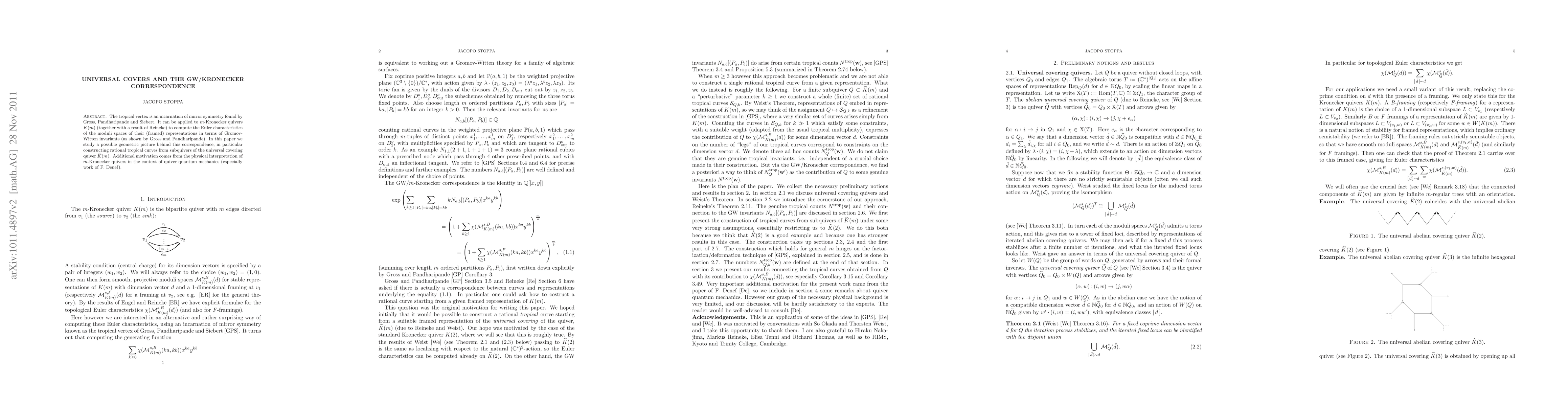 This paper explores the geometric underpinnings of the GW/Kronecker correspondence, focusing on constructing rational tropical curves from subquivers of the universal covering quiver of m-Kronecker quivers. It ties in physical interpretations from quiver quantum mechanics to provide a broader context for this mathematical relationship.