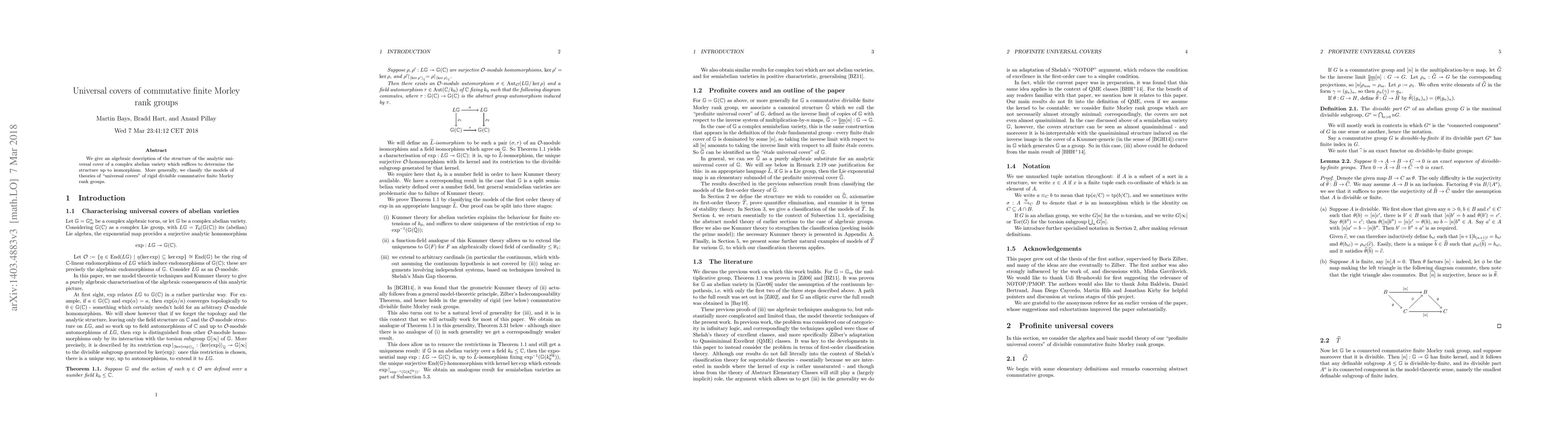 We give an algebraic description of the structure of the analytic universal cover of a complex abelian variety which suffices to determine the structure up to isomorphism. More generally, we classify the models of theories of "universal covers" of rigid divisible commutative finite Morley rank groups.