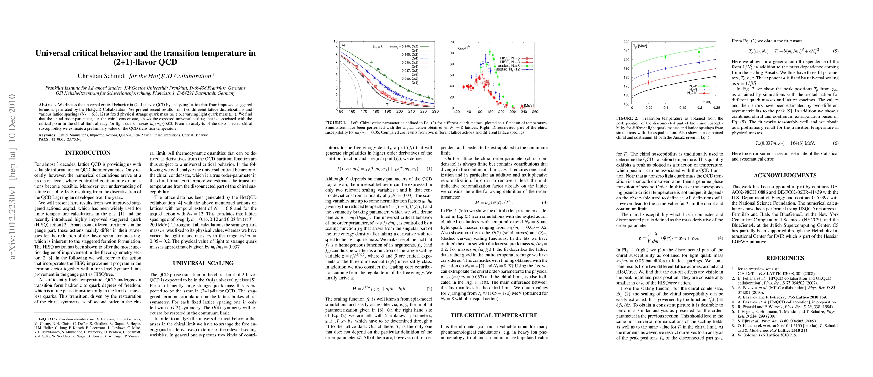 We discuss the universal critical behavior in (2+1)-flavor QCD by analyzing lattice data from improved staggered fermions generated by the HotQCD Collaboration. We present recent results from two different lattice discretizations and various lattice spacings ($N_\tau=6,8,12$) at fixed physical strange quark mass ($m_s$) but varying light quark mass ($m_l$). We find that the chiral order-parameter, i.e. the chiral condensate, shows the expected universal scaling that is associated with the critical point in the chiral limit already for light quark masses $m_l/m_s \lsim 0.05$. From an analysis of the disconnected chiral susceptibility we estimate a preliminary value of the QCD transition temperature.