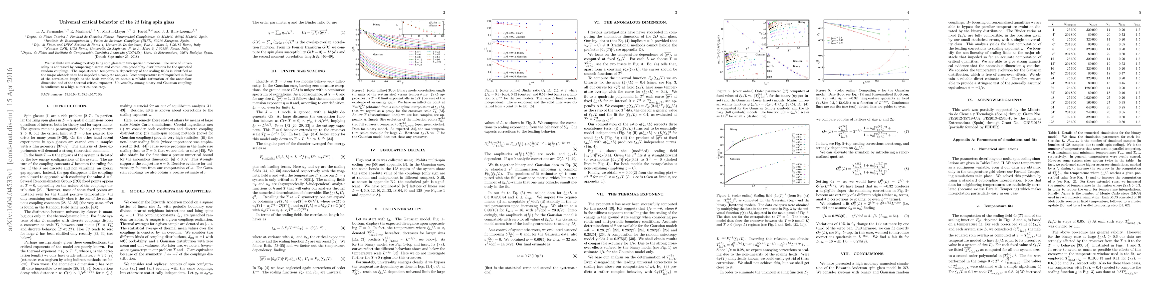 We use finite size scaling to study Ising spin glasses in two spatial dimensions. The issue of universality is addressed by comparing discrete and continuous probability distributions for the quenched random couplings. The sophisticated temperature dependency of the scaling fields is identified as the major obstacle that has impeded a complete analysis. Once temperature is relinquished in favor of the correlation length as the basic variable, we obtain a reliable estimation of the anomalous dimension and of the thermal critical exponent. Universality among binary and Gaussian couplings is confirmed to a high numerical accuracy.
