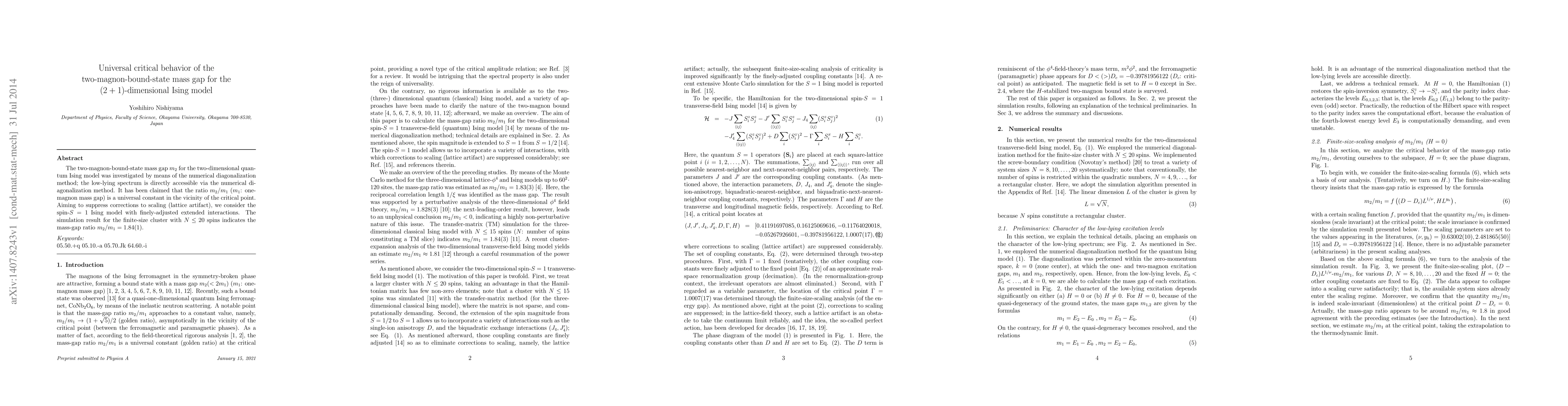 The two-magnon-bound-state mass gap m_2 for the two-dimensional quantum Ising model was investigated by means of the numerical diagonalization method; the low-lying spectrum is directly accessible via the numerical diagonalization method. It has been claimed that the ratio m_2/m_1 (m_1: one-magnon mass gap) is a universal constant in the vicinity of the critical point. Aiming to suppress corrections to scaling (lattice artifact), we consider the spin-S=1 Ising model with finely-adjusted extended interactions. The simulation result for the finite-size cluster with N \le 20 spins indicates the mass-gap ratio m_2/m_1=1.84(1).