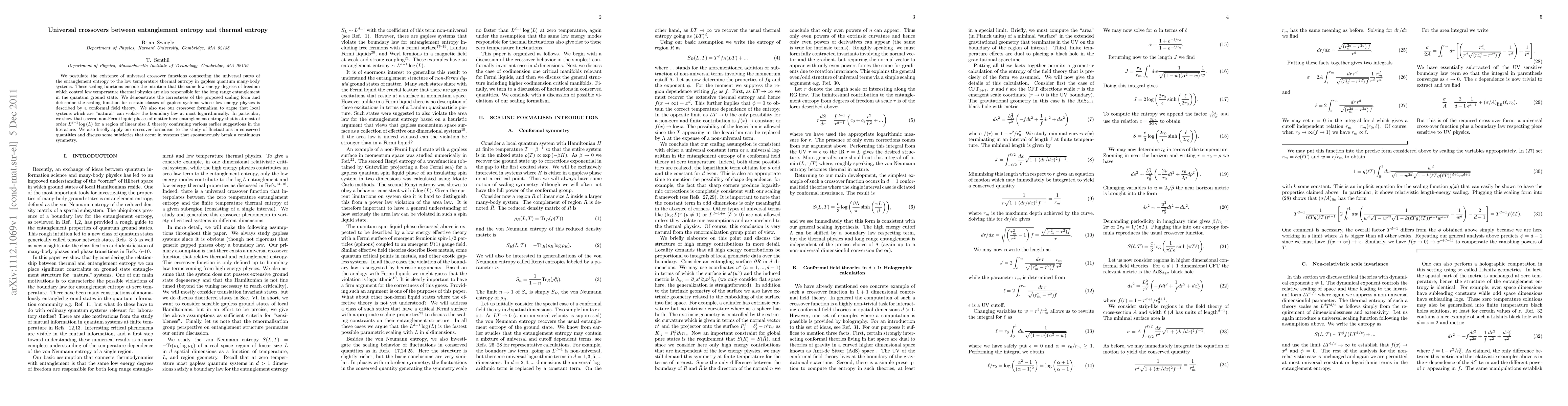 We postulate the existence of universal crossover functions connecting the universal parts of the entanglement entropy to the low temperature thermal entropy in gapless quantum many-body systems. These scaling functions encode the intuition that the same low energy degrees of freedom which control low temperature thermal physics are also responsible for the long range entanglement in the quantum ground state. We demonstrate the correctness of the proposed scaling form and determine the scaling function for certain classes of gapless systems whose low energy physics is described by a conformal field theory. We also use our crossover formalism to argue that local systems which are "natural" can violate the boundary law at most logarithmically. In particular, we show that several non-Fermi liquid phases of matter have entanglement entropy that is at most of order $L^{d-1}\log{(L)} $ for a region of linear size $L$ thereby confirming various earlier suggestions in the literature. We also briefly apply our crossover formalism to the study of fluctuations in conserved quantities and discuss some subtleties that occur in systems that spontaneously break a continuous symmetry.