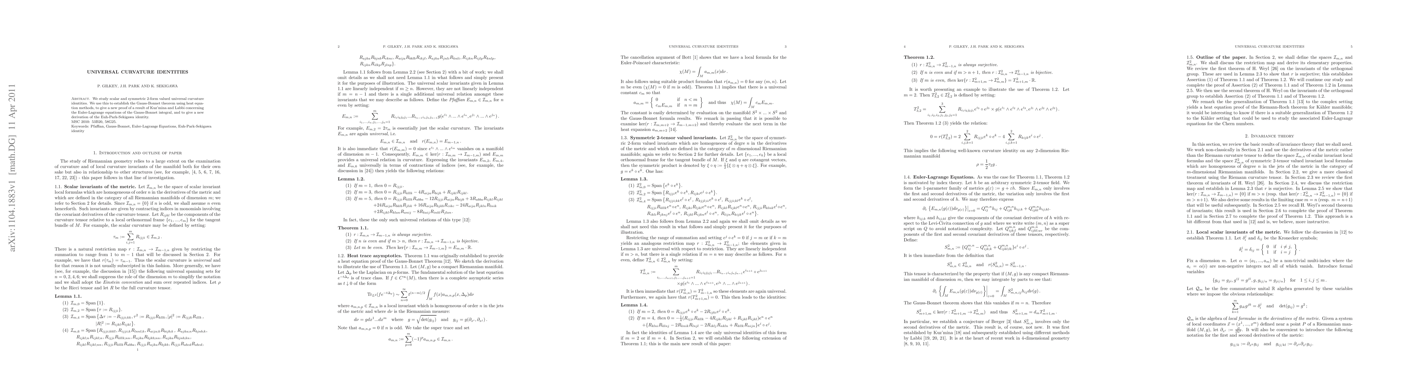 We study scalar and symmetric 2-form valued universal curvature identities. We use this to establish the Gauss-Bonnet theorem using heat equation methods, to give a new proof of a result of Kuz'mina and Labbi concerning the Euler-Lagrange equations of the Gauss-Bonnet integral, and to give a new derivation of the Euh-Park-Sekigawa identity.