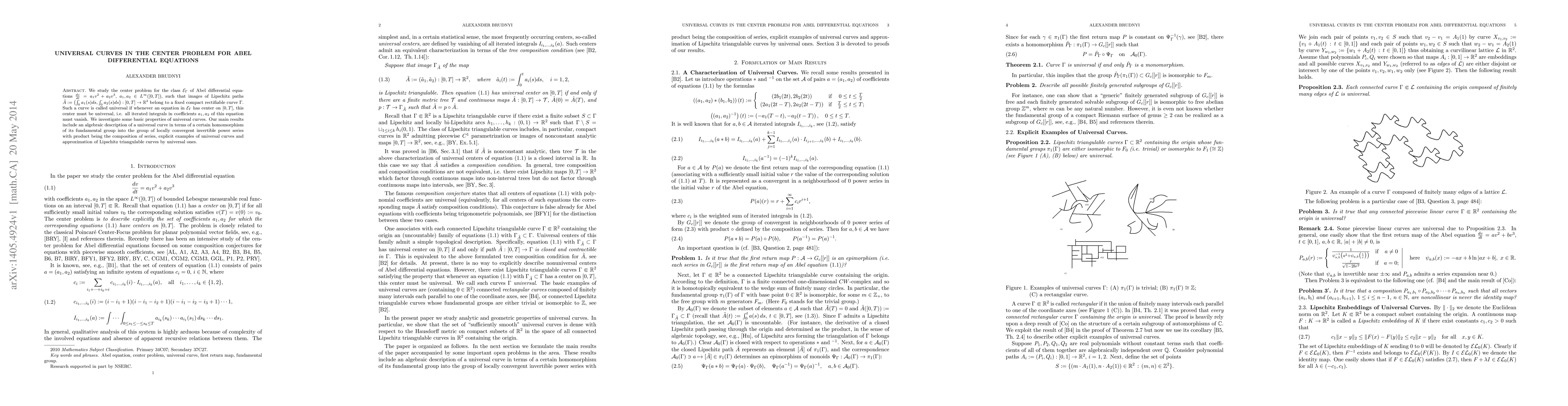 We study the center problem for the class $\mathcal E_\Gamma$ of Abel differential equations $\frac{dv}{dt}=a_1 v^2+a_2 v^3$, $a_1,a_2\in L^\infty ([0,T])$, such that images of Lipschitz paths $\tilde A:=\bigl(\int_0^\cdot a_1(s)ds, \int_0^\cdot a_2(s)ds\bigr): [0,T]\rightarrow\mathbb R^2$ belong to a fixed compact rectifiable curve $\Gamma$. Such a curve is called universal if whenever an equation in $\mathcal E_\Gamma$ has center on $[0,T]$, this center must be universal, i.e. all iterated integrals in coefficients $a_1, a_2$ of this equation must vanish. We investigate some basic properties of universal curves. Our main results include an algebraic description of a universal curve in terms of a certain homomorphism of its fundamental group into the group of locally convergent invertible power series with product being the composition of series, explicit examples of universal curves and approximation of Lipschitz triangulable curves by universal ones.