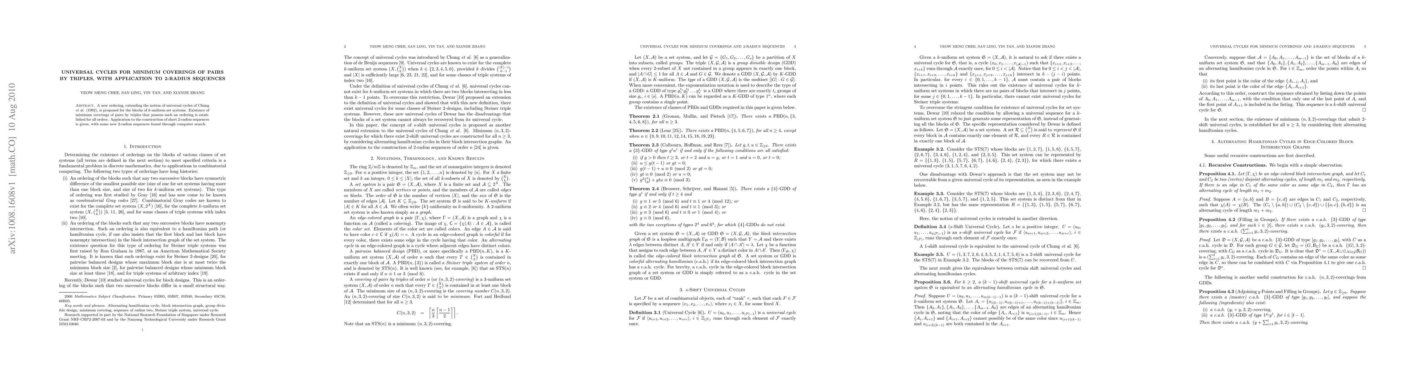 A new ordering, extending the notion of universal cycles of Chung {\em et al.} (1992), is proposed for the blocks of $k$-uniform set systems. Existence of minimum coverings of pairs by triples that possess such an ordering is established for all orders. Application to the construction of short 2-radius sequences is given, with some new 2-radius sequences found through computer search.