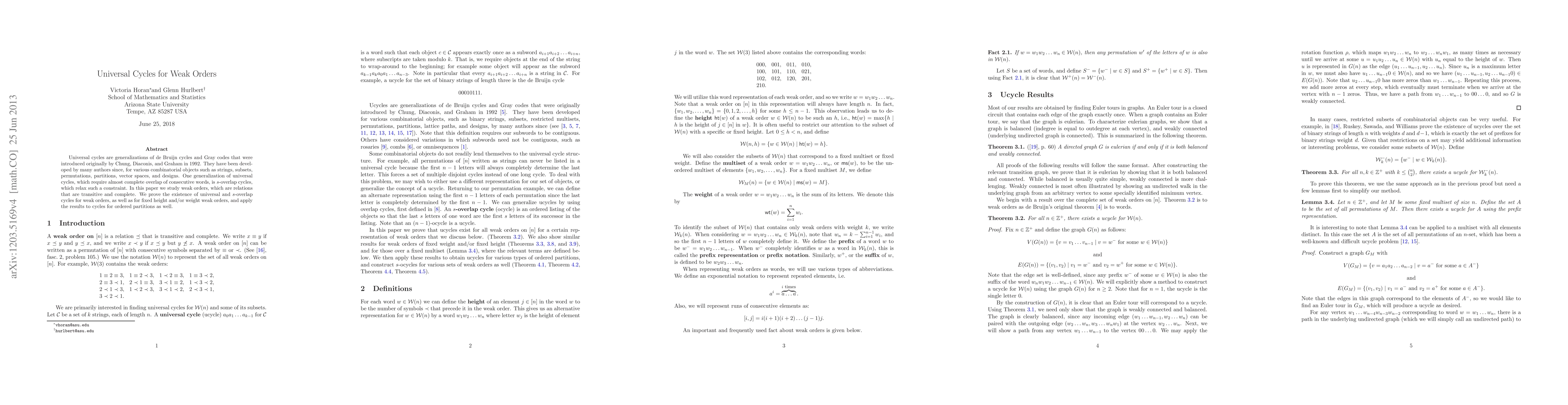 This paper explores the existence of universal and s-overlap cycles for weak orders, which are transitive and complete relations. It proves the existence of these cycles and extends the results to fixed height and weight weak orders, applying the findings to ordered partitions.