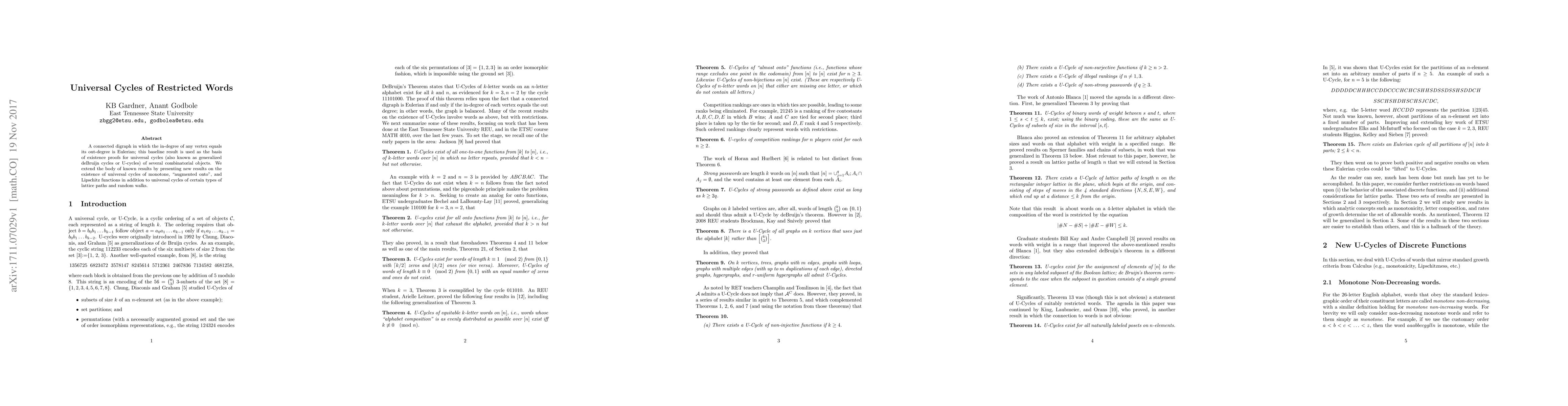 The research extends known results on universal cycles (U-cycles) by presenting new existence proofs for monotone, 'augmented onto', and Lipschitz functions, as well as certain types of lattice paths and random walks.
