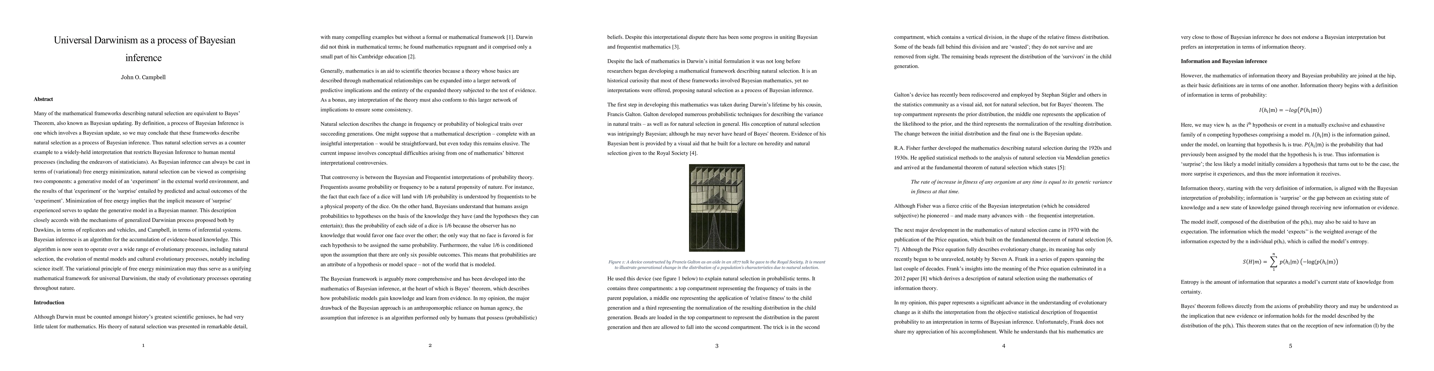 This paper argues that natural selection can be described as a process of Bayesian inference, challenging the notion that Bayesian updating is exclusive to human cognition. It posits that natural selection involves a generative model and the minimization of free energy, which updates the model based on "surprise" from the environment, thus unifying evolutionary processes under a common mathematical framework.