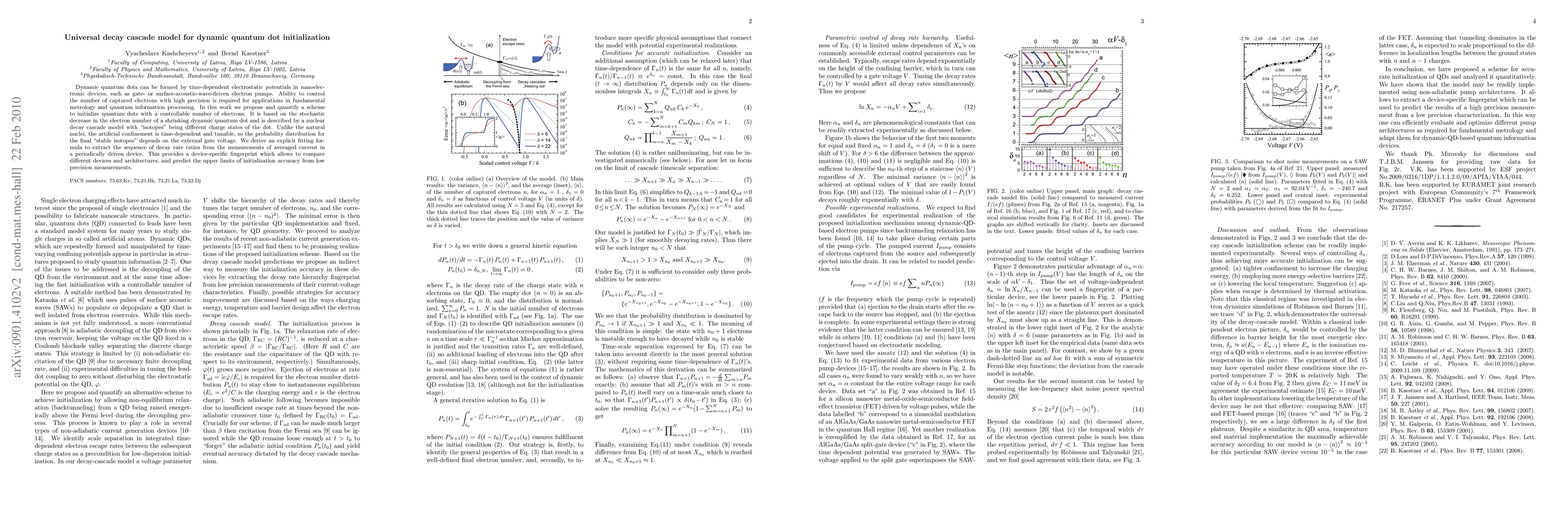 Dynamic quantum dots can be formed by time-dependent electrostatic potentials in nanoelectronic devices, such as gate- or surface-acoustic-wave-driven electron pumps. Ability to control the number of captured electrons with high precision is required for applications in fundamental metrology and quantum information processing. In this work we propose and quantify a scheme to initialize quantum dots with a controllable number of electrons. It is based on the stochastic decrease in the electron number of a shrinking dynamic quantum dot and is described by a nuclear decay cascade model with "isotopes" being different charge states of the dot. Unlike the natural nuclei, the artificial confinement is time-dependent and tunable, so the probability distribution for the final "stable isotopes" depends on the external gate voltage. We derive an explicit fitting formula to extract the sequence of decay rate ratios from the measurements of averaged current in a periodically driven device. This provides a device-specific fingerprint which allows to compare different devices and architectures, and predict the upper limits of initialization accuracy from low precision measurements.