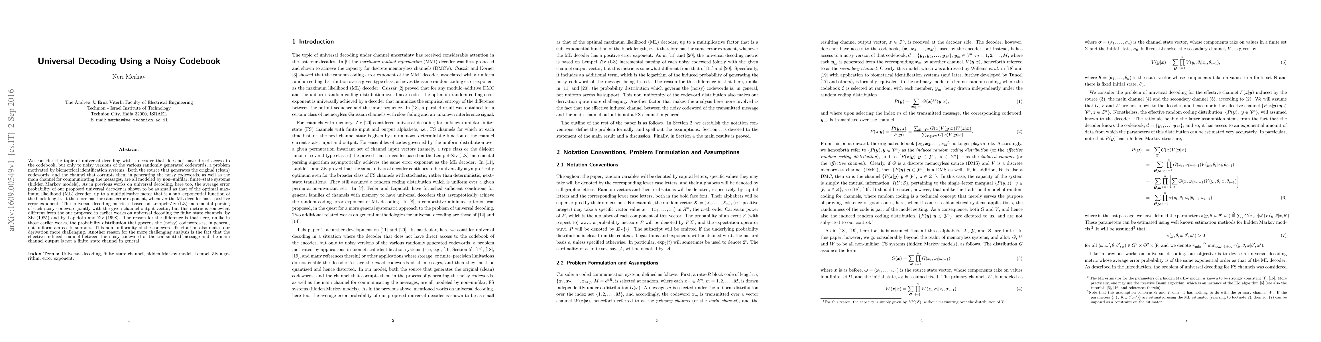 This paper proposes a universal decoding method for systems where the decoder lacks direct access to the codebook, relying instead on noisy versions of the codewords, relevant for biometric identification systems. The method achieves error performance comparable to the optimal maximum likelihood decoder, using a modified Lempel-Ziv parsing approach to handle the non-uniform distribution of noisy codewords.