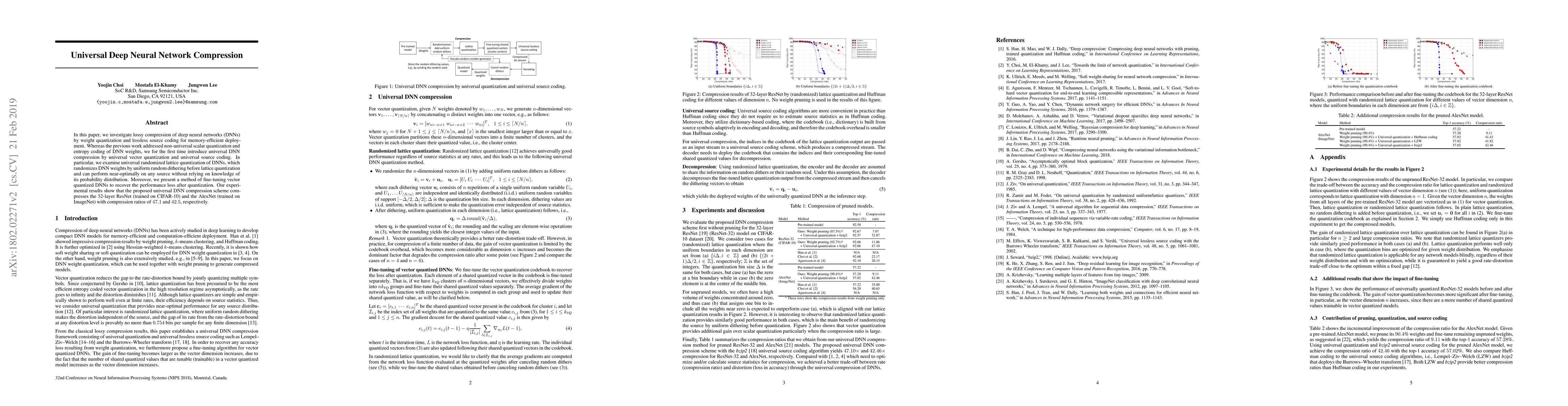 The research investigates universal deep neural network compression through weight quantization and lossless source coding. It introduces universal randomized lattice quantization, which randomizes DNN weights via uniform random dithering before lattice quantization, ensuring near-optimal performance on any source without distribution knowledge. Fine-tuning of vector quantized DNNs is also presented to recover performance loss post-quantization.