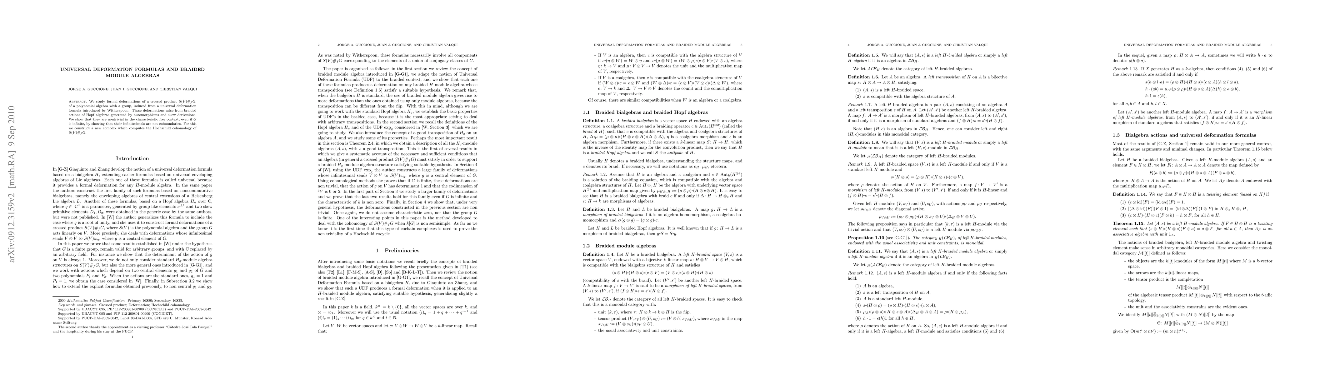 The paper explores formal deformations of a crossed product algebra $S(V)#_f G$ using a universal deformation formula, demonstrating their nontriviality via a new Hochschild cohomology complex. It shows these deformations arise from braided actions of Hopf algebras and their infinitesimals are not coboundaries.