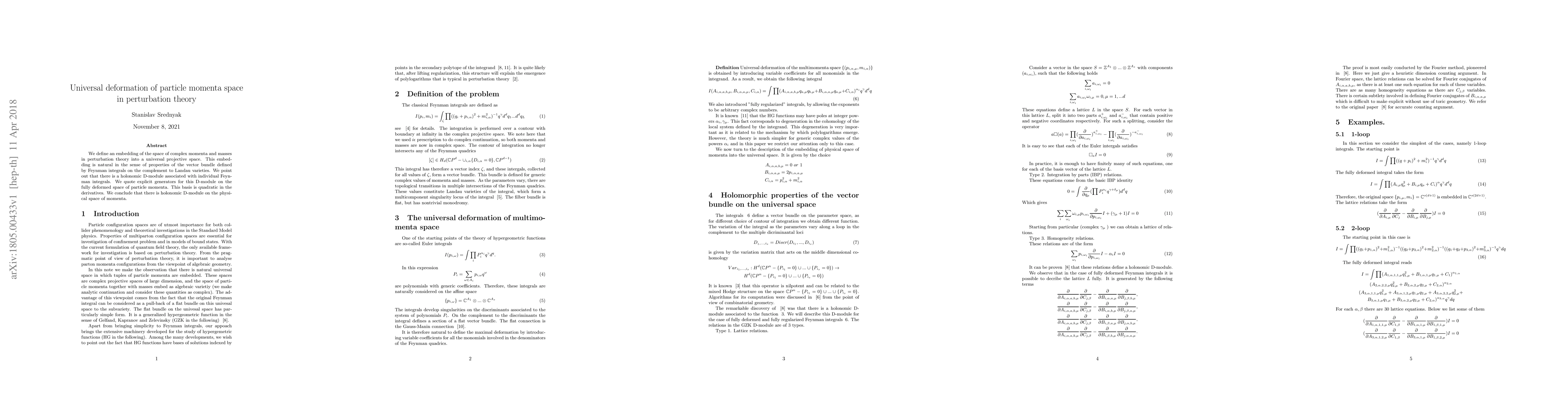 We define an embedding of the space of complex momenta and masses in perturbation theory into a universal projective space. This embedding is natural in the sense of properties of the vector bundle defined by Feynman integrals on the complement to Landau varieties. We point out that there is a holonomic D-module associated with individual Feynman integrals. We quote explicit generators for this D-module on the fully deformed space of particle momenta. This basis is quadratic in the derivatives. We conclude that there is holonomic D-module on the physical space of momenta.