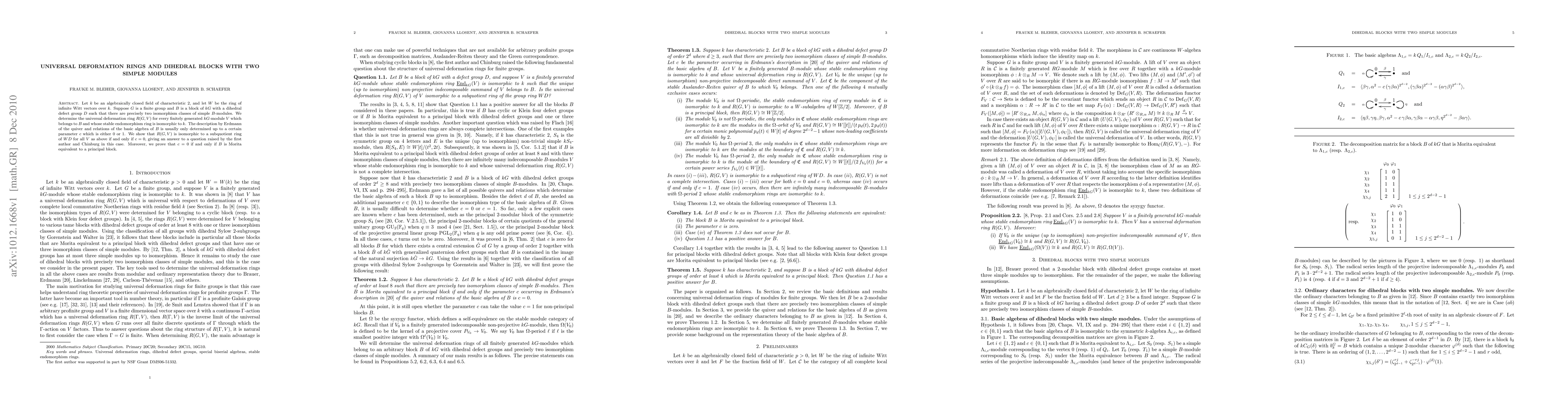 Let k be an algebraically closed field of characteristic 2, and let W be the ring of infinite Witt vectors over k. Suppose G is a finite group and B is a block of kG with a dihedral defect group D such that there are precisely two isomorphism classes of simple B-modules. We determine the universal deformation ring R(G,V) for every finitely generated kG-module V which belongs to B and whose stable endomorphism ring is isomorphic to k. The description by Erdmann of the quiver and relations of the basic algebra of B is usually only determined up to a certain parameter c which is either 0 or 1. We show that R(G,V) is isomorphic to a subquotient ring of WD for all V as above if and only if c=0, giving an answer to a question raised by the first author and Chinburg in this case. Moreover, we prove that c=0 if and only if B is Morita equivalent to a principal block.