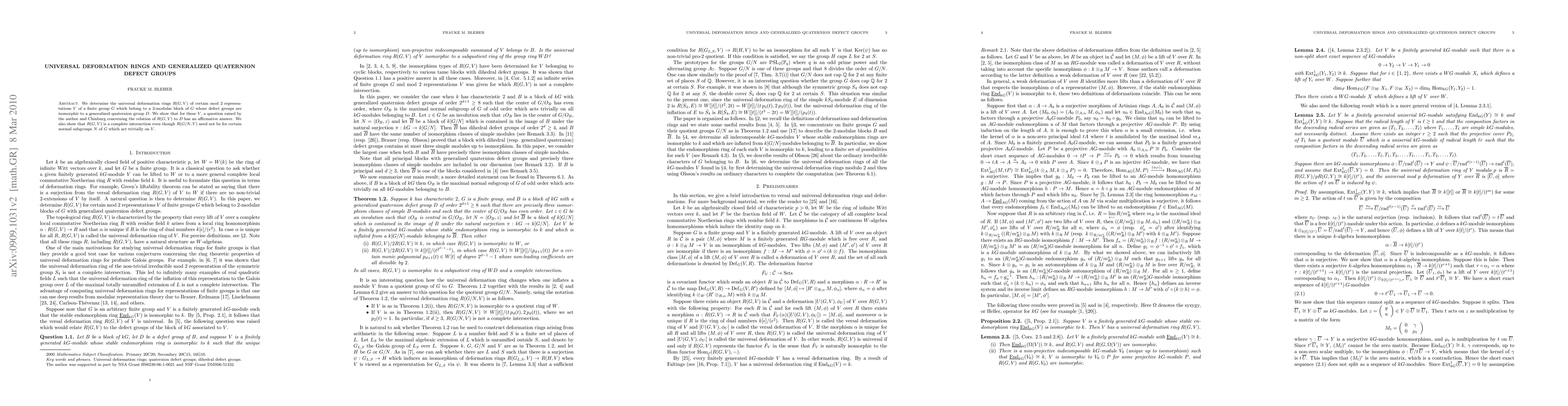 This paper establishes the universal deformation ring R(G,V) for mod 2 representations V of a finite group G within a 2-modular block with generalized quaternion defect groups, confirming a prior conjecture. It also demonstrates that R(G,V) is a complete intersection despite R(G/N,V) not necessarily being so for specific trivial normal subgroups N of G.