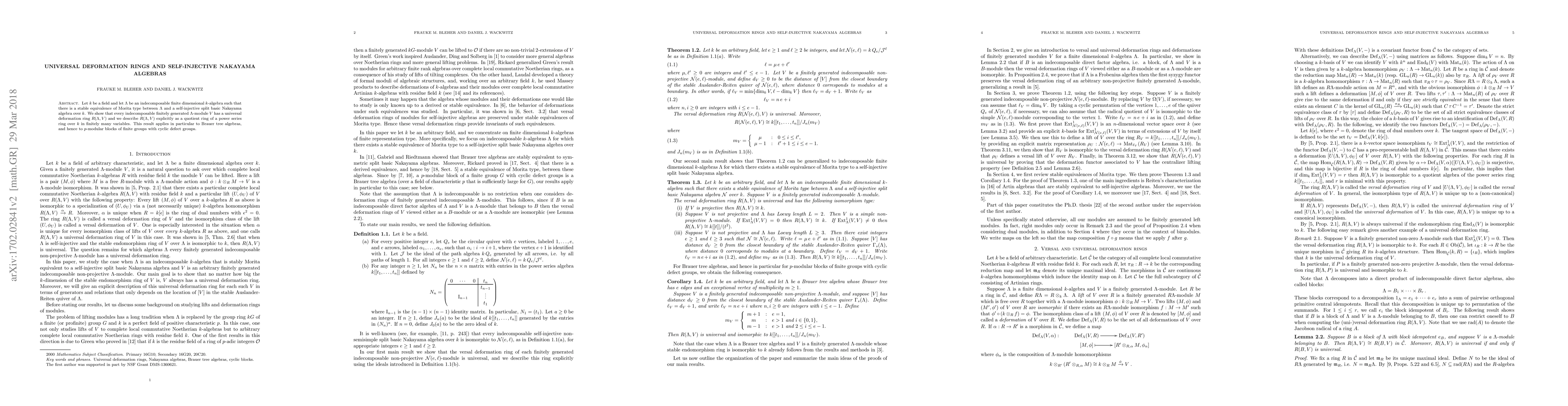 The paper establishes that indecomposable modules over certain algebras, specifically those stably equivalent to self-injective Nakayama algebras, possess universal deformation rings described explicitly as quotient rings of power series rings. This applies notably to Brauer tree algebras and $p$-modular blocks of finite groups.
