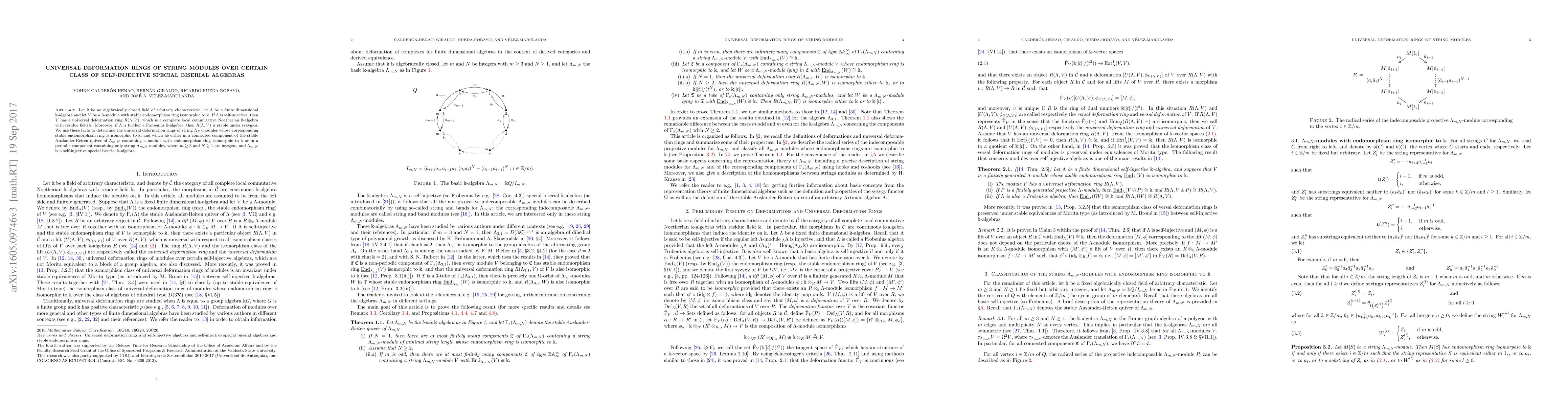 Let $\mathbf{k}$ be an algebraically closed field of arbitrary characteristic, let $\Lambda$ be a finite dimensional $\mathbf{k}$-algebra and let $V$ be a $\Lambda$-module with stable endomorphism ring isomorphic to $\mathbf{k}$. If $\Lambda$ is self-injective, then $V$ has a universal deformation ring $R(\Lambda,V)$, which is a complete local commutative Noetherian $\mathbf{k}$-algebra with residue field $\mathbf{k}$. Moreover, if $\Lambda$ is further a Frobenius $\mathbf{k}$-algebra, then $R(\Lambda,V)$ is stable under syzygies. We use these facts to determine the universal deformation rings of string $\Lambda_{m,N}$-modules whose corresponding stable endomorphism ring is isomorphic to $\mathbf{k}$, and which lie either in a connected component of the stable Auslander-Reiten quiver of $\Lambda_{m,N}$ containing a module with endomorphism ring isomorphic to $\mathbf{k}$ or in a periodic component containing only string $\Lambda_{m,N}$-modules, where $m\geq 3$ and $N\geq 1$ are integers, and $\Lambda_{m,N}$ is a self-injective special biserial $\mathbf{k}$-algebra.