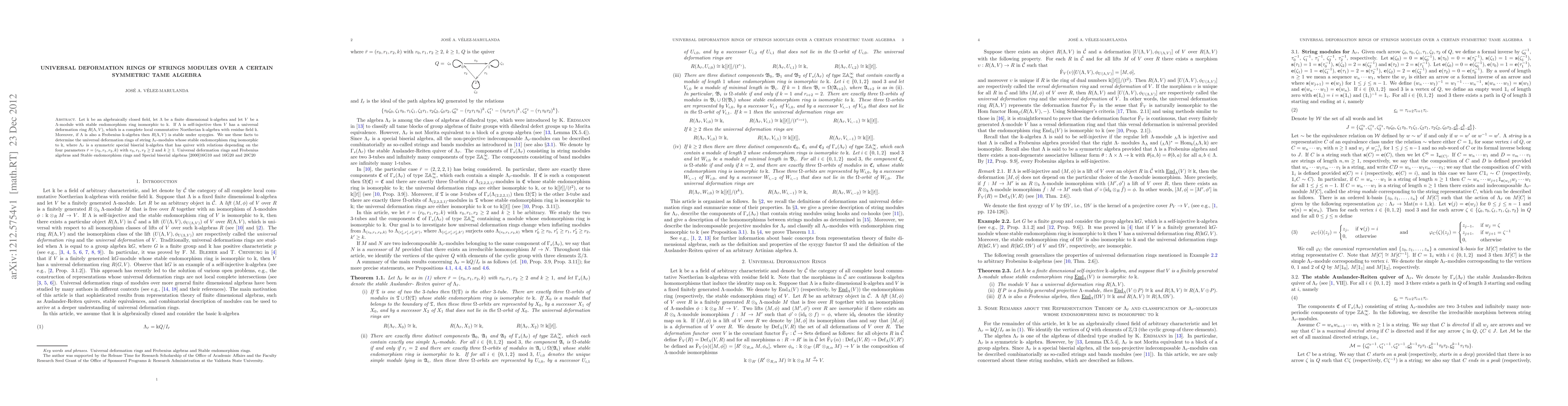 Let $\k$ be an algebraically closed field, let $\A$ be a finite dimensional $\k$-algebra and let $V$ be a $\A$-module with stable endomorphism ring isomorphic to $\k$. If $\A$ is self-injective then $V$ has a universal deformation ring $R(\A,V)$, which is a complete local commutative Noetherian $\k$-algebra with residue field $\k$. Moreover, if $\Lambda$ is also a Frobenius $\k$-algebra then $R(\A,V)$ is stable under syzygies. We use these facts to determine the universal deformation rings of string $\Ar$-modules whose stable endomorphism ring isomorphic to $\k$, where $\Ar$ is a symmetric special biserial $\k$-algebra that has quiver with relations depending on the four parameters $ \bar{r}=(r_0,r_1,r_2,k)$ with $r_0,r_1,r_2\geq 2$ and $k\geq 1$.
