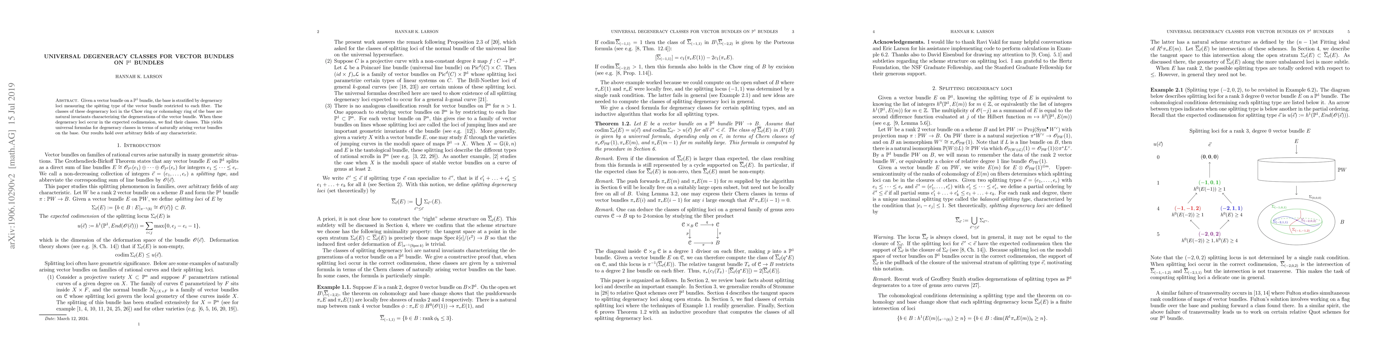 This paper identifies universal degeneracy classes for vector bundles on $\mathbb{P}^1$ by examining the splitting types of restricted bundles on stratified base loci. It derives formulas for these classes in the Chow or cohomology ring, applicable over any field regardless of characteristic.
