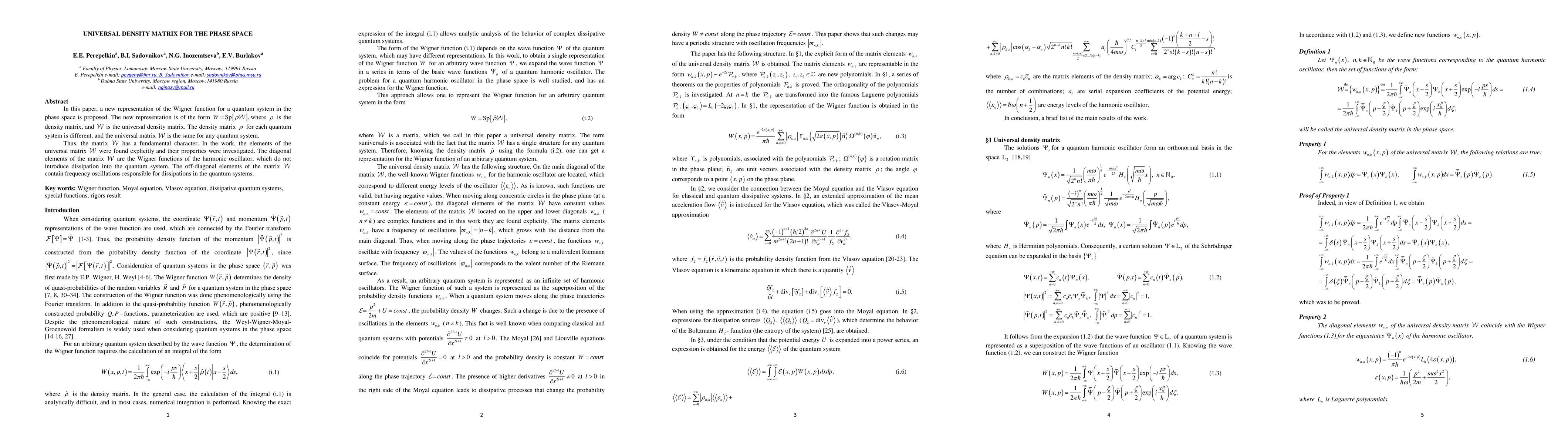 In this paper, a new representation of the Wigner function for a quantum system in the phase space is proposed. The new representation is of the form $W=\operatorname{Sp}\left[ \rho \mathcal{W} \right]$, where $\rho$ is the density matrix, and $\mathcal{W}$ is the universal density matrix. The density matrix $\rho$ for each quantum system is different, and the universal matrix $\mathcal{W}$ is the same for any quantum system. Thus, the matrix $\mathcal{W}$ has a fundamental character. In the work, the elements of the universal matrix $\mathcal{W}$ were found explicitly and their properties were investigated. The diagonal elements of the matrix $\mathcal{W}$ are the Wigner functions of the harmonic oscillator, which do not introduce dissipation into the quantum system. The off-diagonal elements of the matrix $\mathcal{W}$ contain frequency oscillations responsible for dissipations in the quantum systems.