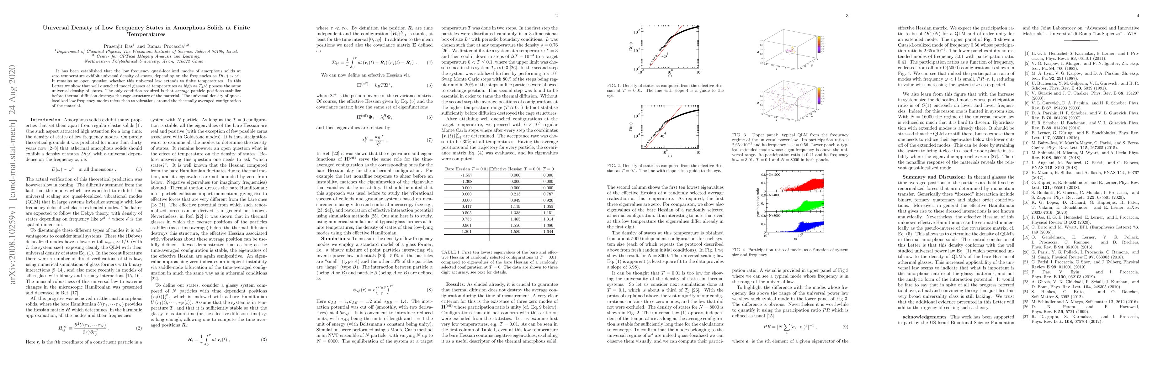 This paper demonstrates that low frequency quasi-localized modes in amorphous solids maintain a universal density of states, $D(\omega) \sim \omega^4$, even at finite temperatures up to $T_g/3$, provided the material's average particle positions stabilize before thermal diffusion disrupts its structure. This finding extends the universal density law from zero to finite temperatures.