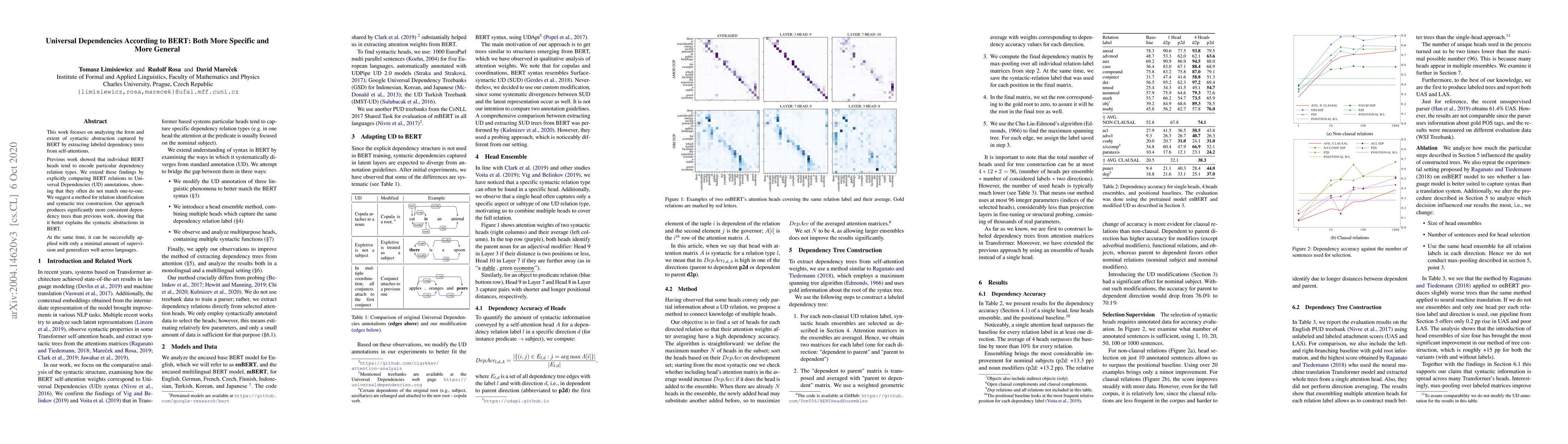 This work focuses on analyzing the form and extent of syntactic abstraction captured by BERT by extracting labeled dependency trees from self-attentions. Previous work showed that individual BERT heads tend to encode particular dependency relation types. We extend these findings by explicitly comparing BERT relations to Universal Dependencies (UD) annotations, showing that they often do not match one-to-one. We suggest a method for relation identification and syntactic tree construction. Our approach produces significantly more consistent dependency trees than previous work, showing that it better explains the syntactic abstractions in BERT. At the same time, it can be successfully applied with only a minimal amount of supervision and generalizes well across languages.