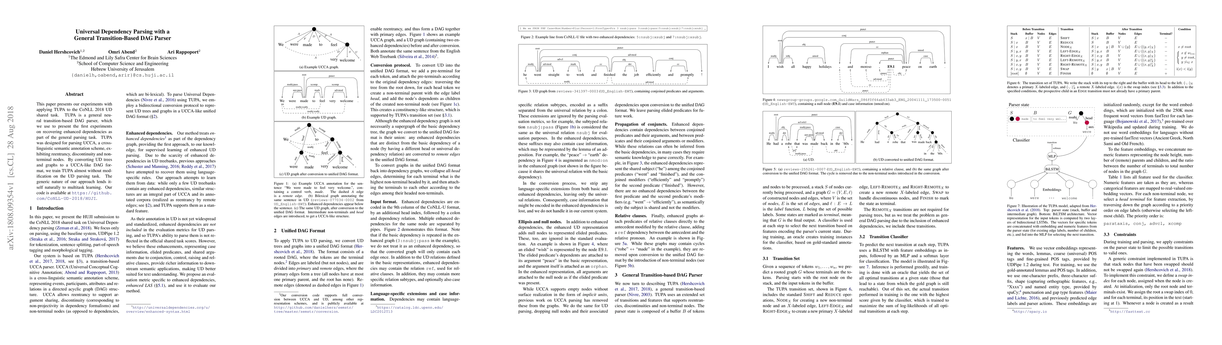 This paper presents our experiments with applying TUPA to the CoNLL 2018 UD shared task. TUPA is a general neural transition-based DAG parser, which we use to present the first experiments on recovering enhanced dependencies as part of the general parsing task. TUPA was designed for parsing UCCA, a cross-linguistic semantic annotation scheme, exhibiting reentrancy, discontinuity and non-terminal nodes. By converting UD trees and graphs to a UCCA-like DAG format, we train TUPA almost without modification on the UD parsing task. The generic nature of our approach lends itself naturally to multitask learning. Our code is available at https://github.com/CoNLL-UD-2018/HUJI