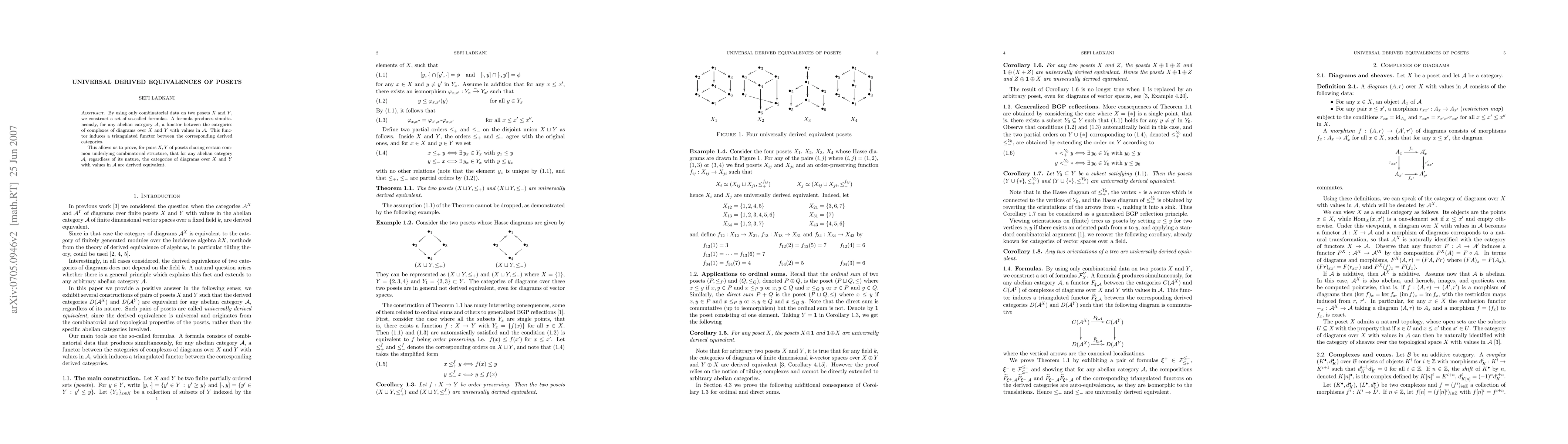 By using only combinatorial data on two posets X and Y, we construct a set of so-called formulas. A formula produces simultaneously, for any abelian category A, a functor between the categories of complexes of diagrams over X and Y with values in A. This functor induces a triangulated functor between the corresponding derived categories. This allows us to prove, for pairs X, Y of posets sharing certain common underlying combinatorial structure, that for any abelian category A, regardless of its nature, the categories of diagrams over X and Y with values in A are derived equivalent.