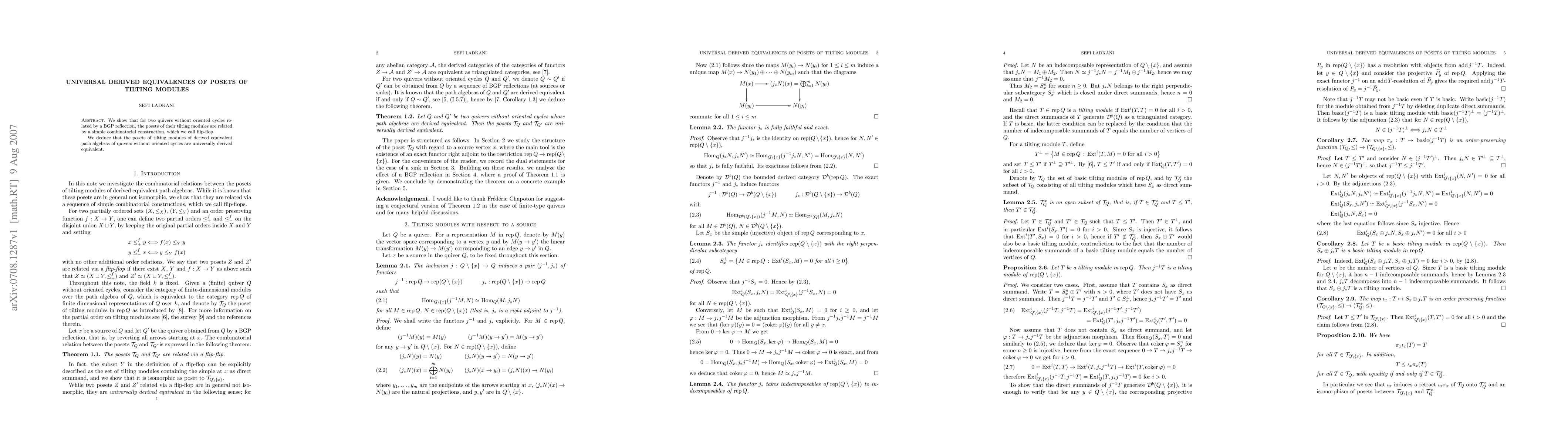 This paper demonstrates that posets of tilting modules for quivers without oriented cycles, related by a BGP reflection, exhibit a combinatorial relationship called flip-flop. Consequently, it concludes that tilting modules of derived equivalent path algebras of such quivers are universally derived equivalent.