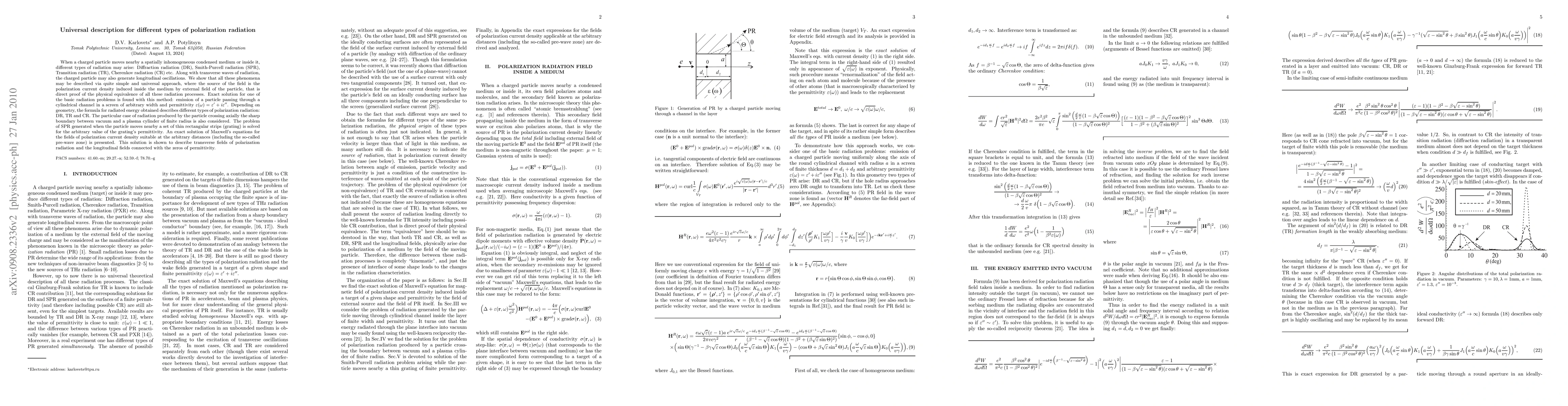When a charged particle moves nearby a spatially inhomogeneous condensed medium or inside it, different types of radiation may arise: Diffraction radiation (DR), Smith-Purcell radiation (SPR), Transition radiation (TR), Cherenkov radiation (CR) etc. Along with transverse waves of radiation, the charged particle may also generate longitudinal oscillations. We show that all these phenomena may be described via quite simple and universal approach, where the source of the field is the polarization current density induced inside the medium by external field of the particle, that is direct proof of the physical equivalence of all these radiation processes. Exact solution for one of the basic radiation problems is found with this method: emission of a particle passing through a cylindrical channel in a screen of arbitrary width and permittivity $\epsilon (\omega) = \epsilon^{\prime} + i \epsilon^{\prime \prime}$. Depending on geometry, the formula for radiated energy obtained describes different types of polarization radiation: DR, TR and CR. The particular case of radiation produced by the particle crossing axially the sharp boundary between vacuum and a plasma cylinder of finite radius is also considered. The problem of SPR generated when the particle moves nearby a set of thin rectangular strips (grating) is solved for the arbitrary value of the grating's permittivity. An exact solution of Maxwell's equations for the fields of polarization current density suitable at the arbitrary distances (including the so-called pre-wave zone) is presented. This solution is shown to describe transverse fields of polarization radiation and the longitudinal fields connected with the zeros of permittivity.