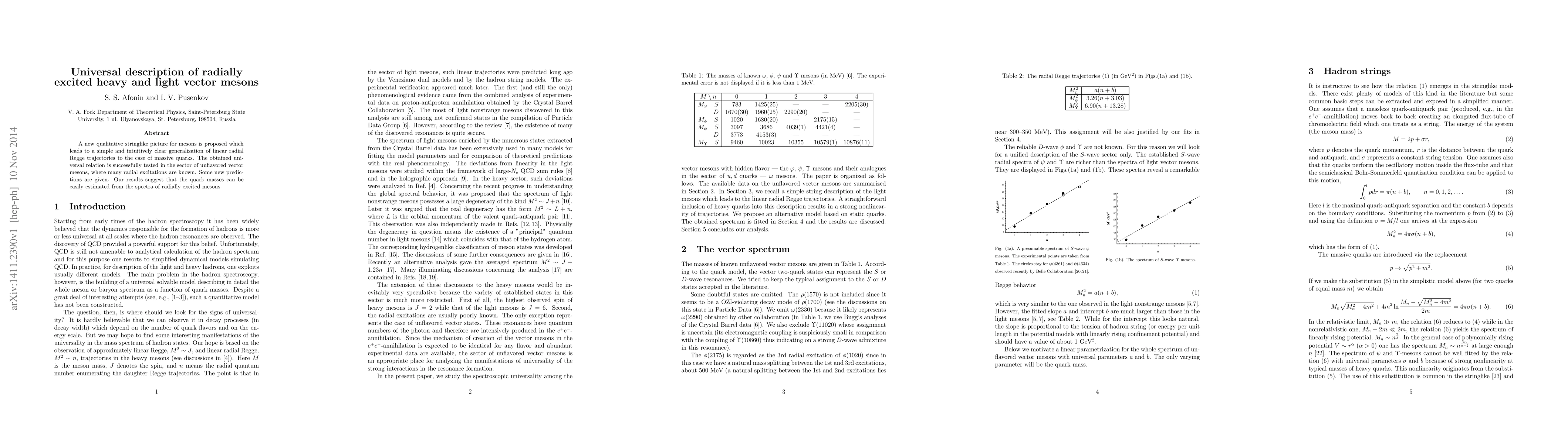 This paper proposes a new stringlike picture for mesons, leading to a universal relation between quark masses and the spectra of radially excited mesons, with successful predictions for unflavored vector mesons.