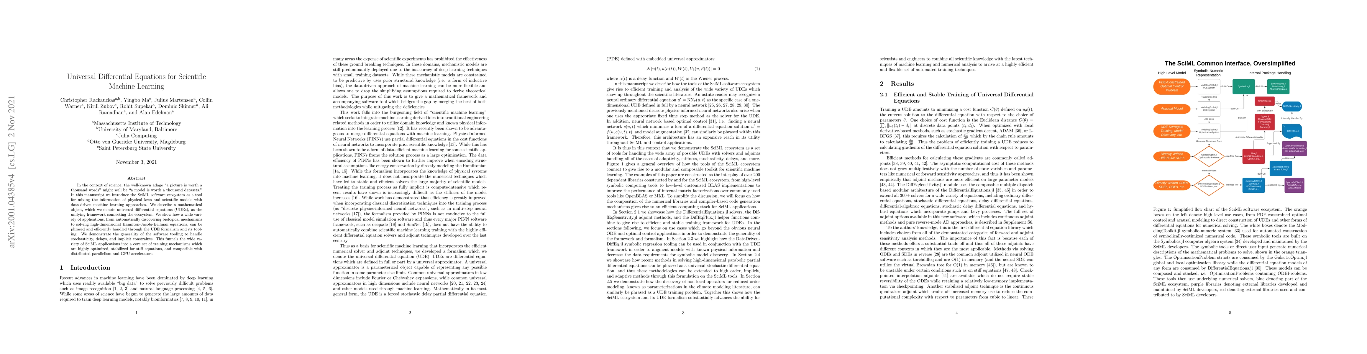 In the context of science, the well-known adage "a picture is worth a thousand words" might well be "a model is worth a thousand datasets." In this manuscript we introduce the SciML software ecosystem as a tool for mixing the information of physical laws and scientific models with data-driven machine learning approaches. We describe a mathematical object, which we denote universal differential equations (UDEs), as the unifying framework connecting the ecosystem. We show how a wide variety of applications, from automatically discovering biological mechanisms to solving high-dimensional Hamilton-Jacobi-Bellman equations, can be phrased and efficiently handled through the UDE formalism and its tooling. We demonstrate the generality of the software tooling to handle stochasticity, delays, and implicit constraints. This funnels the wide variety of SciML applications into a core set of training mechanisms which are highly optimized, stabilized for stiff equations, and compatible with distributed parallelism and GPU accelerators.