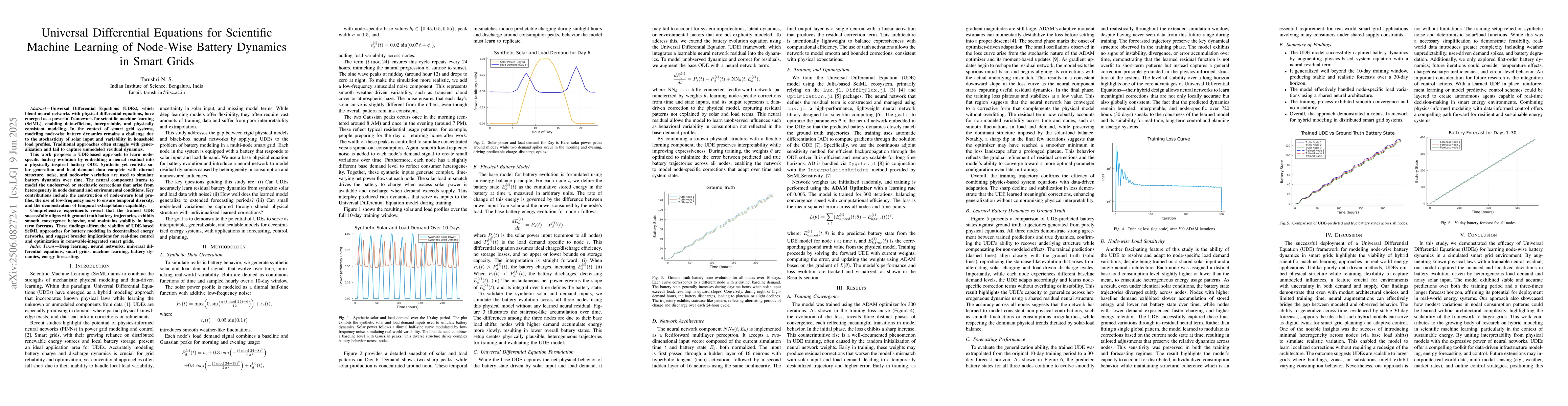 Universal Differential Equations (UDEs), which blend neural networks with physical differential equations, have emerged as a powerful framework for scientific machine learning (SciML), enabling data-efficient, interpretable, and physically consistent modeling. In the context of smart grid systems, modeling node-wise battery dynamics remains a challenge due to the stochasticity of solar input and variability in household load profiles. Traditional approaches often struggle with generalization and fail to capture unmodeled residual dynamics. This work proposes a UDE-based approach to learn node-specific battery evolution by embedding a neural residual into a physically inspired battery ODE. Synthetic yet realistic solar generation and load demand data are used to simulate battery dynamics over time. The neural component learns to model unobserved or stochastic corrections arising from heterogeneity in node demand and environmental conditions. Comprehensive experiments reveal that the trained UDE aligns closely with ground truth battery trajectories, exhibits smooth convergence behavior, and maintains stability in long-term forecasts. These findings affirm the viability of UDE-based SciML approaches for battery modeling in decentralized energy networks and suggest broader implications for real-time control and optimization in renewable-integrated smart grids.