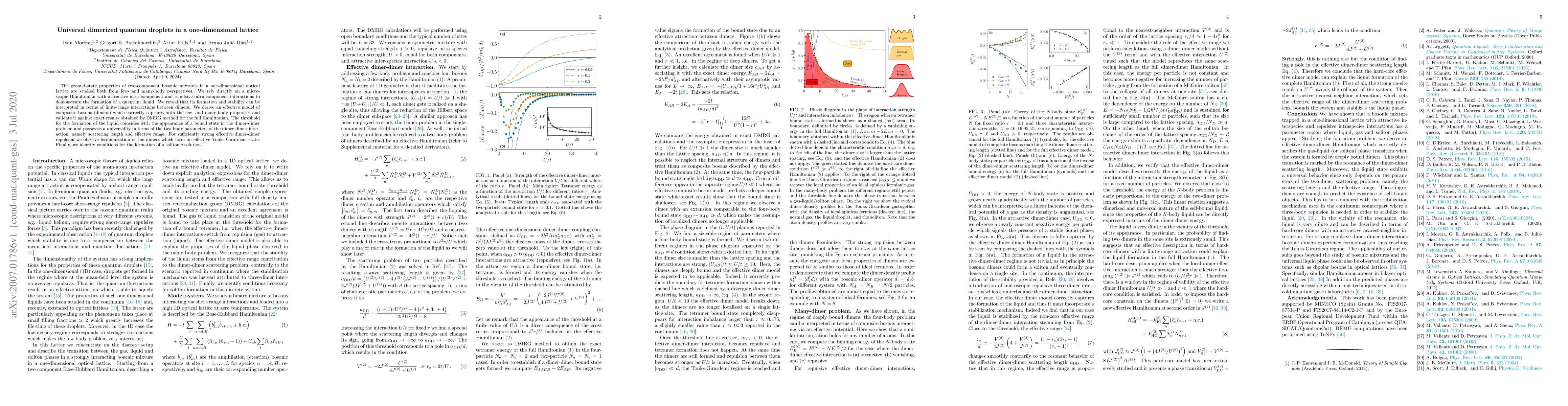 The ground-state properties of two-component bosonic mixtures in a one-dimensional optical lattice are studied both from few- and many-body perspectives. We rely directly on a microscopic Hamiltonian with attractive inter-component and repulsive intra-component interactions to demonstrate the formation of a quantum liquid. We reveal that its formation and stability can be interpreted in terms of finite-range interactions between dimers. We derive an effective model of composite bosons (dimers) which correctly captures both the few- and many-body properties and validate it against exact results obtained by DMRG method for the full Hamiltonian. The threshold for the formation of the liquid coincides with the appearance of a bound state in the dimer-dimer problem and possesses a universality in terms of the two-body parameters of the dimer-dimer interaction, namely scattering length and effective range. For sufficiently strong effective dimer-dimer repulsion we observe fermionization of the dimers which form an effective Tonks-Girardeau state. Finally, we identify conditions for the formation of a solitonic solution.