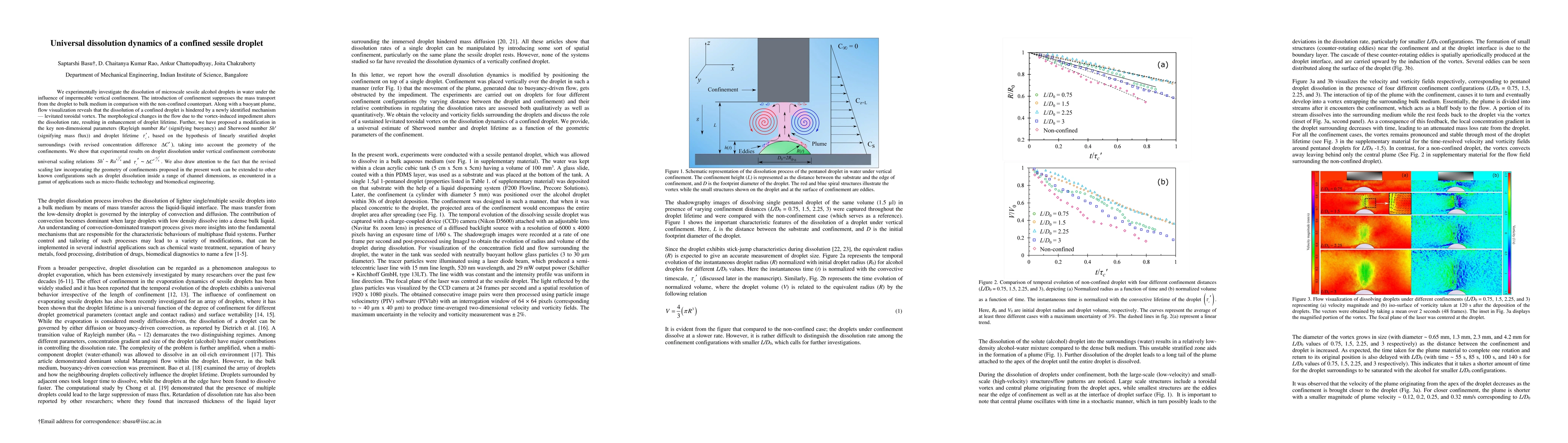 This study experimentally examines the dissolution dynamics of confined sessile alcohol droplets in water, revealing a levitated toroidal vortex mechanism that hinders mass transport and extends droplet lifetime. The research proposes modified non-dimensional parameters and scaling laws that account for the geometry of confinement, showing universal scaling relations that can be applied to various microfluidic and biomedical engineering contexts.