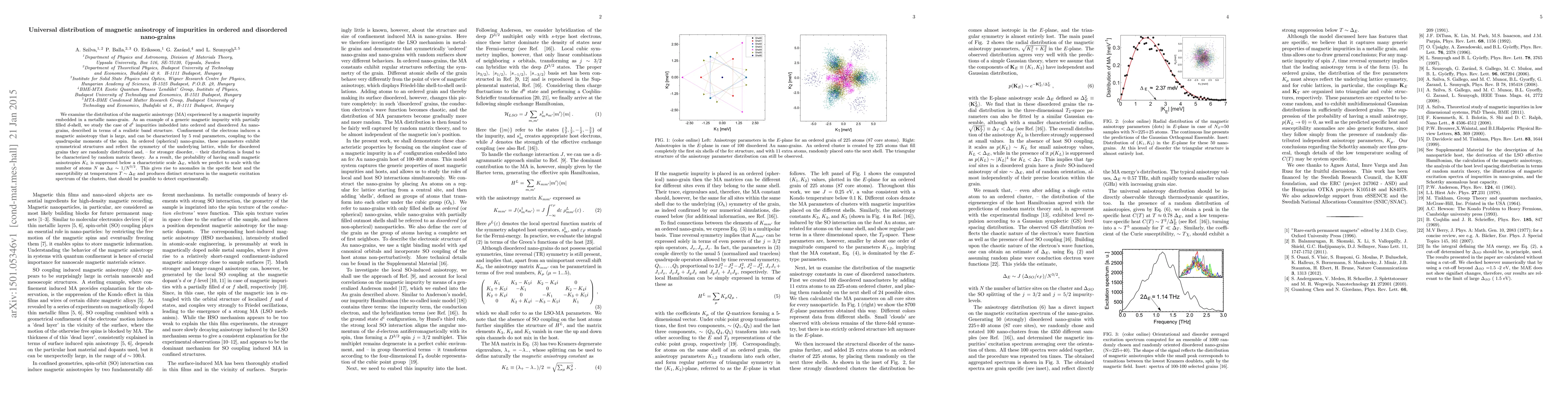 We examine the distribution of the magnetic anisotropy (MA) experienced by a magnetic impurity embedded in a metallic nano-grain. As an example of a generic magnetic impurity with partially filled $d$-shell, we study the case of $d^{1}$ impurities imbedded into ordered and disordered Au nano-grains, described in terms of a realistic band structure. Confinement of the electrons induces a magnetic anisotropy that is large, and can be characterized by 5 real parameters, coupling to the quadrupolar moments of the spin. In ordered (spherical) nano-grains, these parameters exhibit symmetrical structures and reflect the symmetry of the underlying lattice, while for disordered grains they are randomly distributed and, - for stronger disorder, - their distribution is found to be characterized by random matrix theory. As a result, the probability of having small magnetic anisotropies $K_L$ is suppressed below a characteristic scale $\Delta_E$, which we predict to scale with the number of atoms $N$ as $\Delta_E\sim 1/N^{3/2}$. This gives rise to anomalies in the specific heat and the susceptibility at temperatures $T\sim \Delta_E$ and produces distinct structures in the magnetic excitation spectrum of the clusters, that should be possible to detect experimentally.