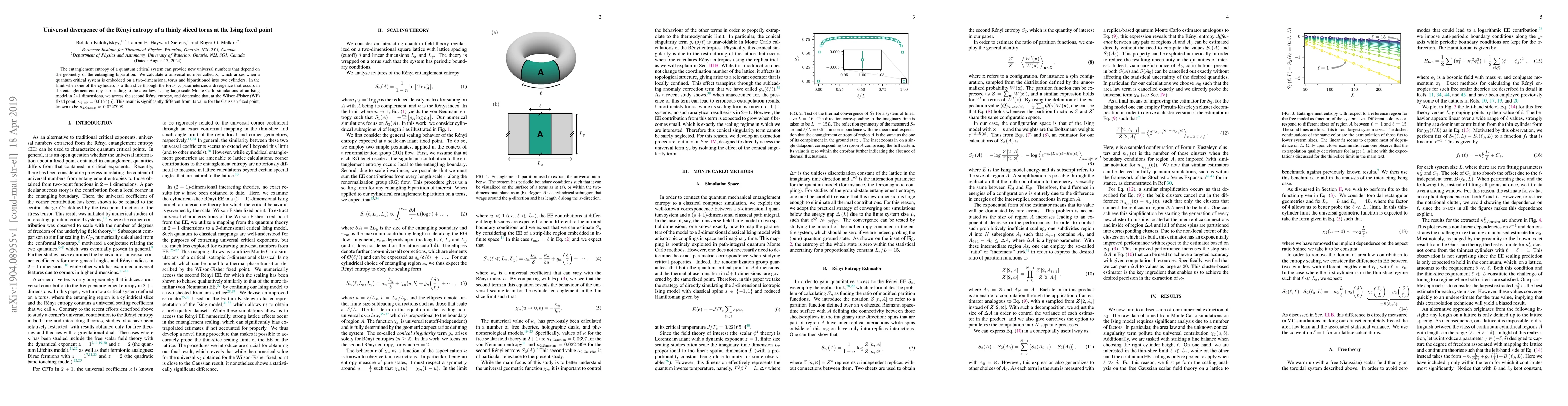 The entanglement entropy of a quantum critical system can provide new universal numbers that depend on the geometry of the entangling bipartition. We calculate a universal number called $\kappa$, which arises when a quantum critical system is embedded on a two-dimensional torus and bipartitioned into two cylinders. In the limit when one of the cylinders is a thin slice through the torus, $\kappa$ parameterizes a divergence that occurs in the entanglement entropy sub-leading to the area law. Using large-scale Monte Carlo simulations of an Ising model in 2+1 dimensions, we access the second Renyi entropy, and determine that, at the Wilson-Fisher (WF) fixed point, $\kappa_{2,\text{WF}} = 0.0174(5)$. This result is significantly different from its value for the Gaussian fixed point, known to be $\kappa_{2,\text{Gaussian}} \approx 0.0227998$.