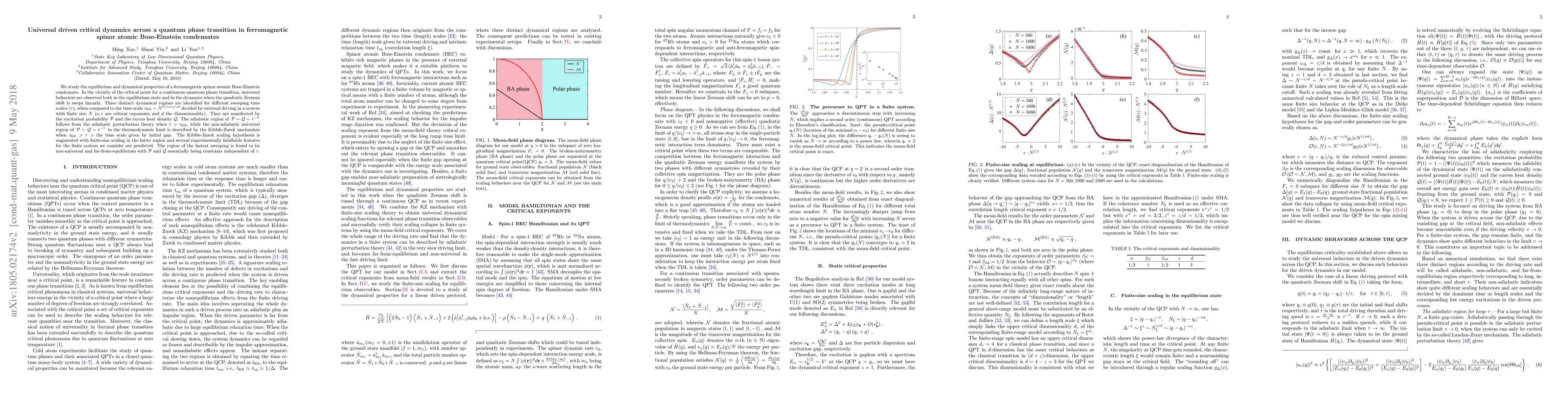 The study examines the equilibrium and dynamical properties of a ferromagnetic spinor atomic Bose-Einstein condensate near a quantum phase transition, using linear sweeping of the quadratic Zeeman shift as a driving protocol.