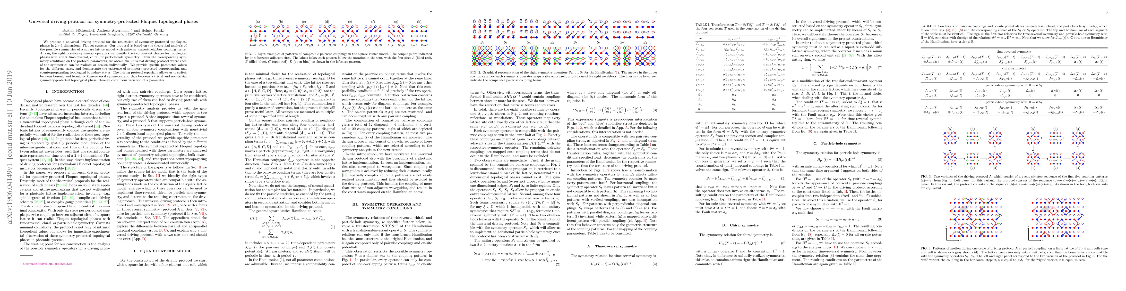 Universal driving protocol for symmetry-protected Floquet topological phasesWe propose a universal driving protocol for the realization of symmetry-protected topological phases in $2+1$ dimensional Floquet systems. Our proposal is based on the theoretical analysis of the possible symmetries of a square lattice model with pairwise nearest-neighbor coupling terms. Among the eight possible symmetry operators we identify the two relevant choices for topological phases with either time-reversal, chiral, or particle-hole symmetry. From the corresponding symmetry conditions on the protocol parameters, we obtain the universal driving protocol where each of the symmetries can be realized or broken individually. We provide specific parameter values for the different cases, and demonstrate the existence of symmetry-protected copropagating and counterpropagating topological boundary states. The driving protocol especially allows us to switch between bosonic and fermionic time-reversal symmetry, and thus between a trivial and non-trivial symmetry-protected topological phase, through continuous variation of a parameter.