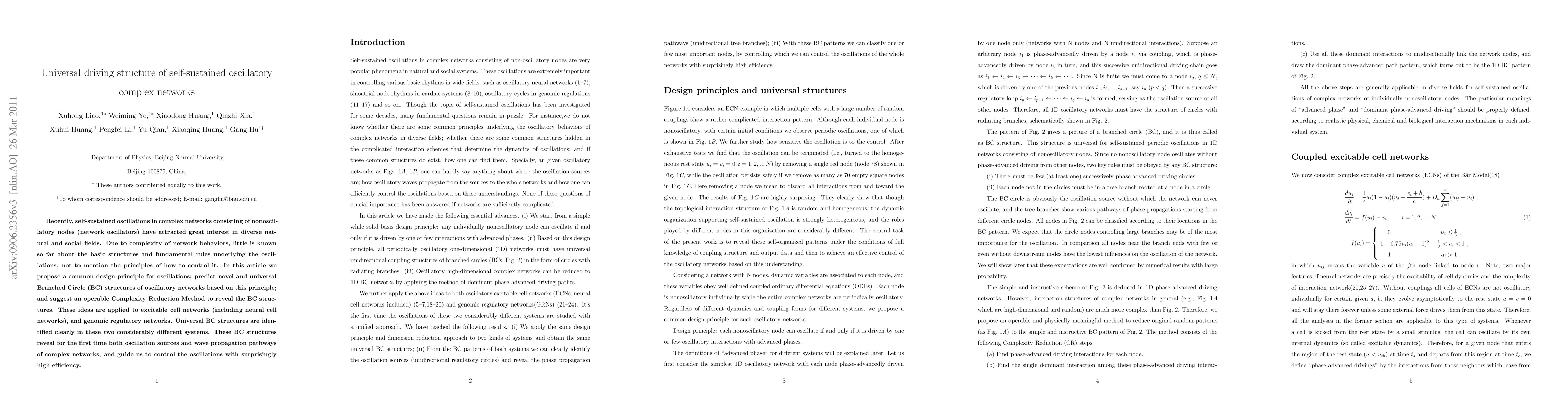 Recently, self-sustained oscillations in complex networks consisting of nonoscillatory nodes (network oscillators) have attracted great interest in diverse natural and social fields. Due to complexity of network behaviors, little is known so far about the basic structures and fundamental rules underlying the oscillations, not to mention the principles of how to control it. In this article we propose a common design principle for oscillations; predict novel and universal Branched Circle (BC) structures of oscillatory networks based on this principle; and suggest an operable Complexity Reduction Method to reveal the BC structures. These ideas are applied to excitable cell networks (including neural cell networks), and genomic regulatory networks. Universal BC structures are identified clearly in these two considerably different systems. These BC structures reveal for the first time both oscillation sources and wave propagation pathways of complex networks, and guide us to control the oscillations with surprisingly high efficiency.