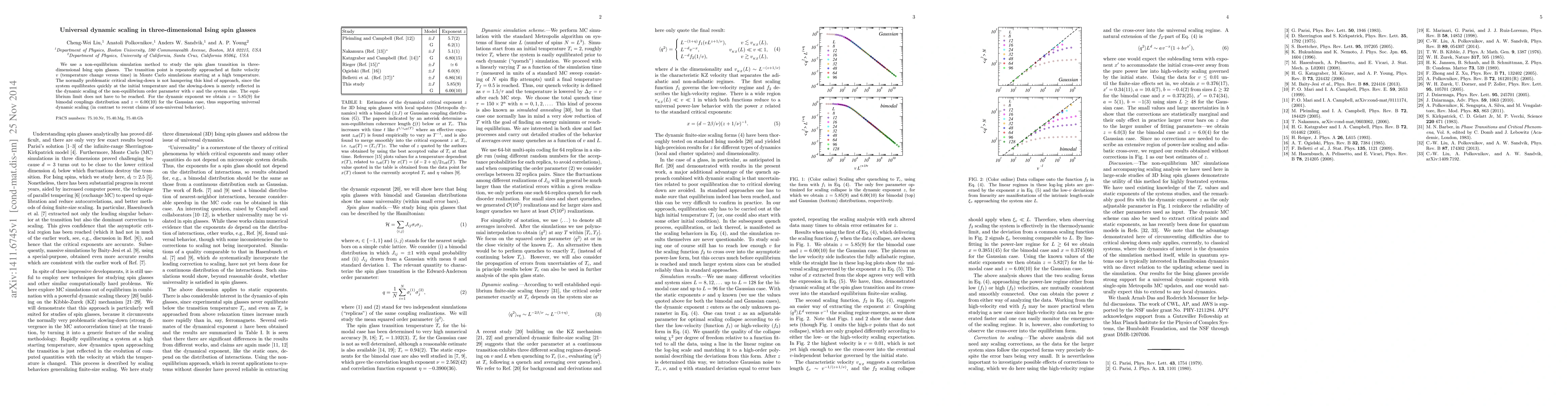 This paper investigates the spin glass transition in three-dimensional Ising spin glasses using non-equilibrium simulations, revealing dynamic scaling behavior with the dynamic exponent $z = 5.85(9)$ for bimodal couplings and $z=6.00(10)$ for Gaussian distributions, supporting universal dynamic scaling.