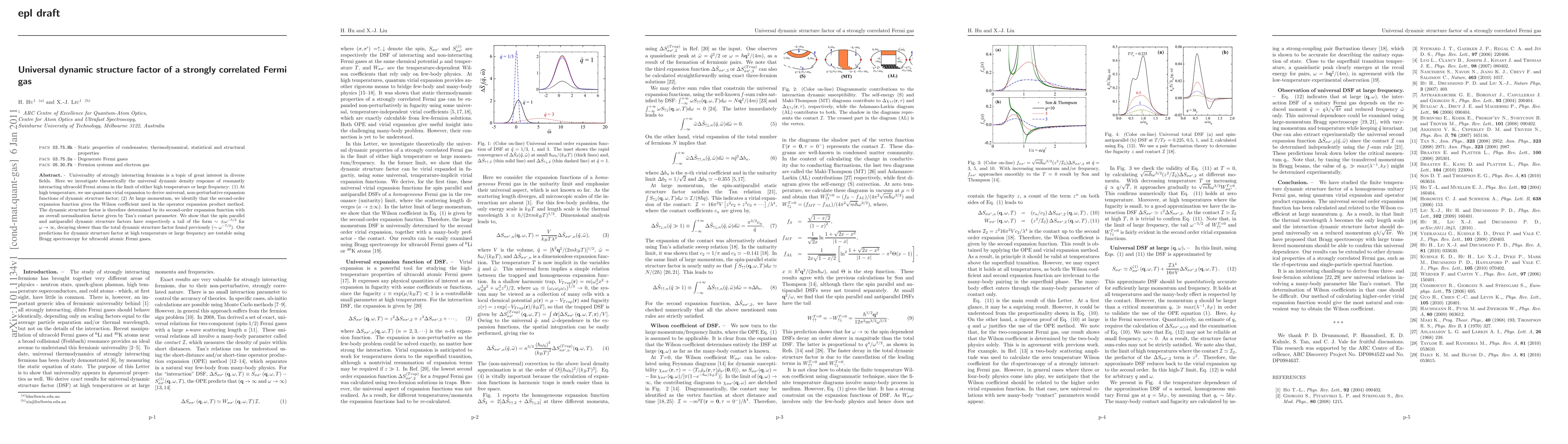 This paper theoretically explores the universal dynamic structure factor of strongly correlated Fermi gases, deriving non-perturbative expansion functions using quantum virial expansion at high temperatures and identifying the Wilson coefficient at large frequencies. The study predicts distinct decay behaviors for spin parallel and antiparallel components, with implications for experimental verification via Bragg spectroscopy.