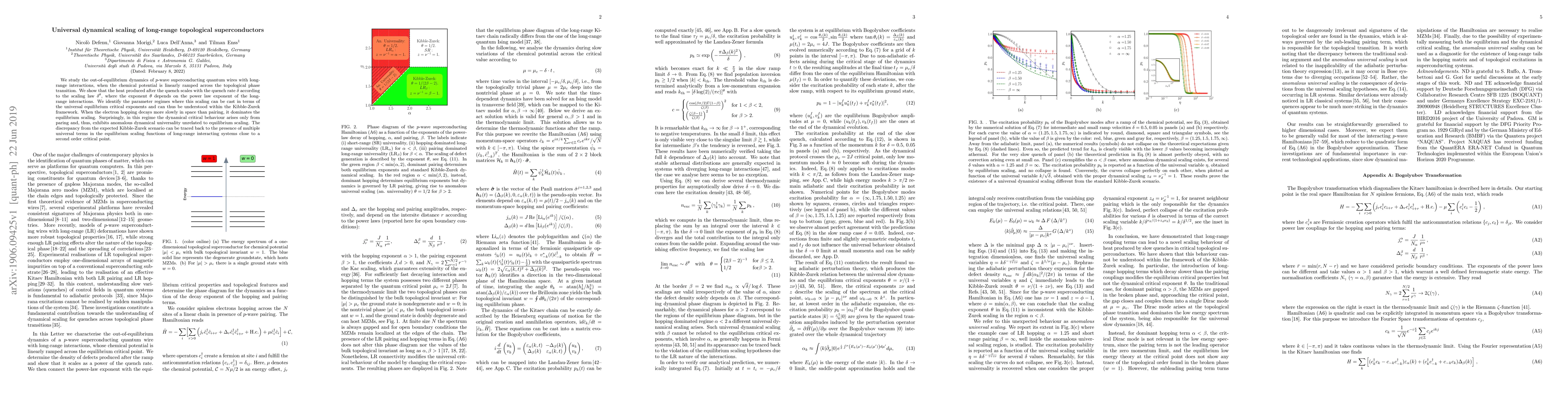 This research investigates the out-of-equilibrium dynamics of $p$-wave topological superconductors under long-range interactions, showing a scaling law for heat production dependent on the quench rate and interaction strength. Anomalous dynamical universality is observed, diverging from the Kibble-Zurek framework due to multiple universal terms in equilibrium scaling functions.